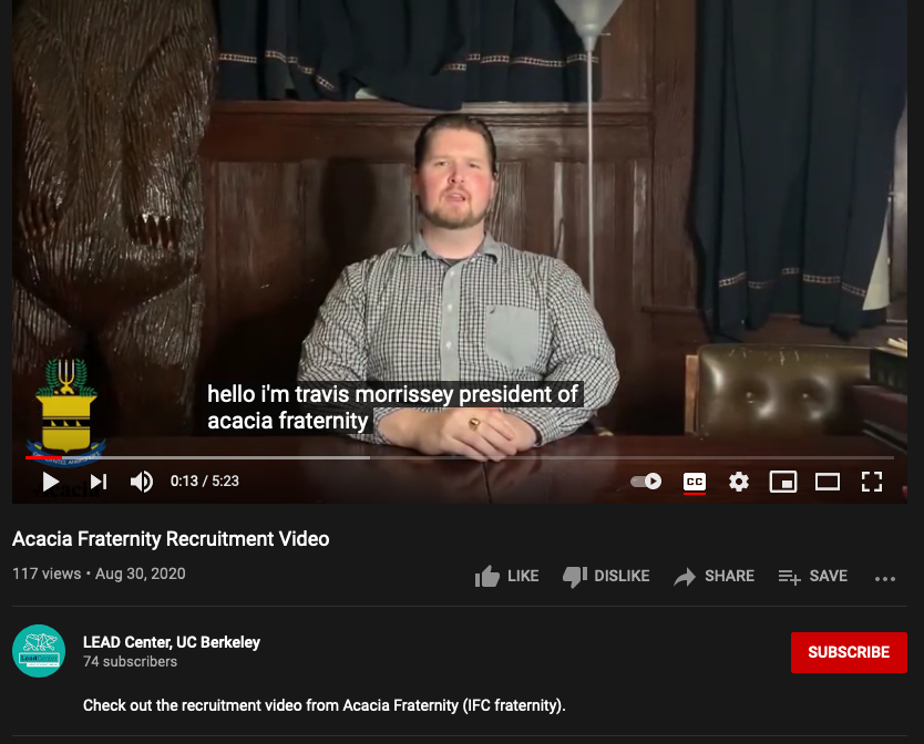 Travis Morrissey featured in an official UC Berkeley LEAD Center YouTube video. At the time of this writing Acacia is listed on the LEAD Center website as part of the Intrafraternal Council and is said to be “expanding” .