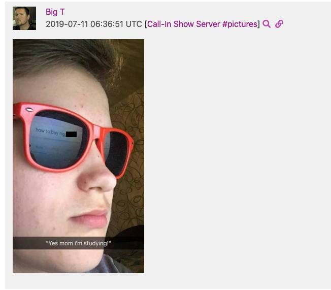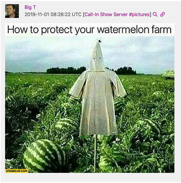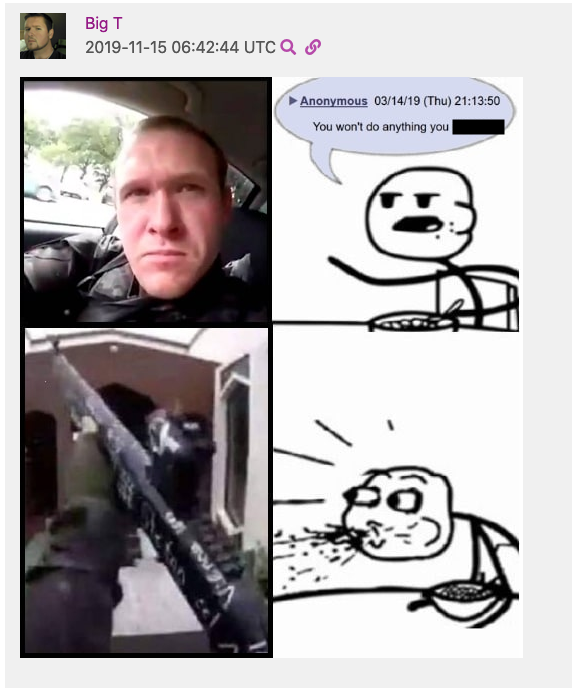 Redacted “meme” of the 2019 Christchurch shooter Brenton Tarrant shared by Travis Morrissey as user “Big T” in the Matt Christiansen and Rebecca Hargreaves “Call-In Show” Discord Server.
