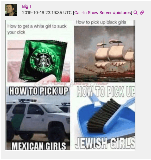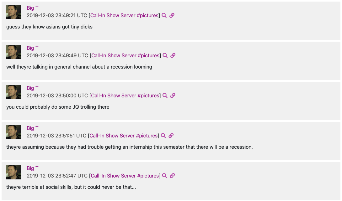 The full content of his messages as user “Big T (Discord ID: 297516168321957889) can be found hosted online at Unicorn Riot’s Far Right Investigations Desk: