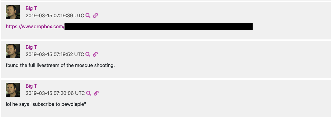 Morrissey sharing the link to the livestream of the 2019 Christchurch shooting hours after it happened. “lol he says ‘subscribe to pewdiepie,'” Morrissey notes.