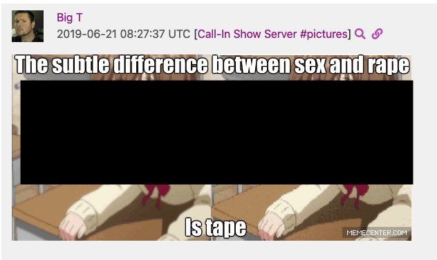 Meme shared repeatedly by Morrisey in the “Call-In Show” Server poking fun at sexual assault
