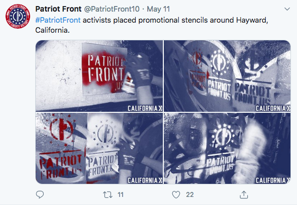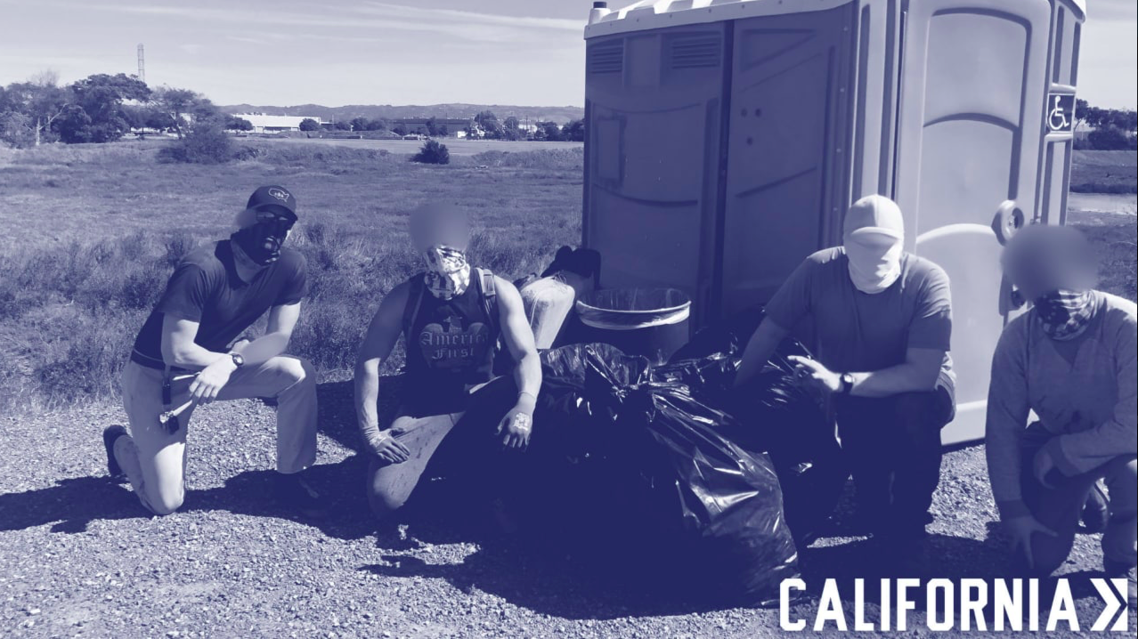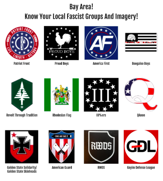 1. Patriot Front (national organization) – “Patriots” by light of day, admitted white nationalists and National Socialists (i.e. Nazis) behind closed doors. Their dream is a white ethnostate with the enforcement of “traditional white families”, with all of the racism, misogyny, homophobia and transphobia that infers. They pretend to be mere conservatives but in private chats they celebrate Hitler’s birthday and admit their goal is to deport all nonwhite people and put “deviants” in work camps. There are between one and three hundred of them in the US and a network of at least 4 known members in Northern CA who occasionally do stickering/stenciling/”trash cleanup” and banner drops in the Bay and post them to their social media.