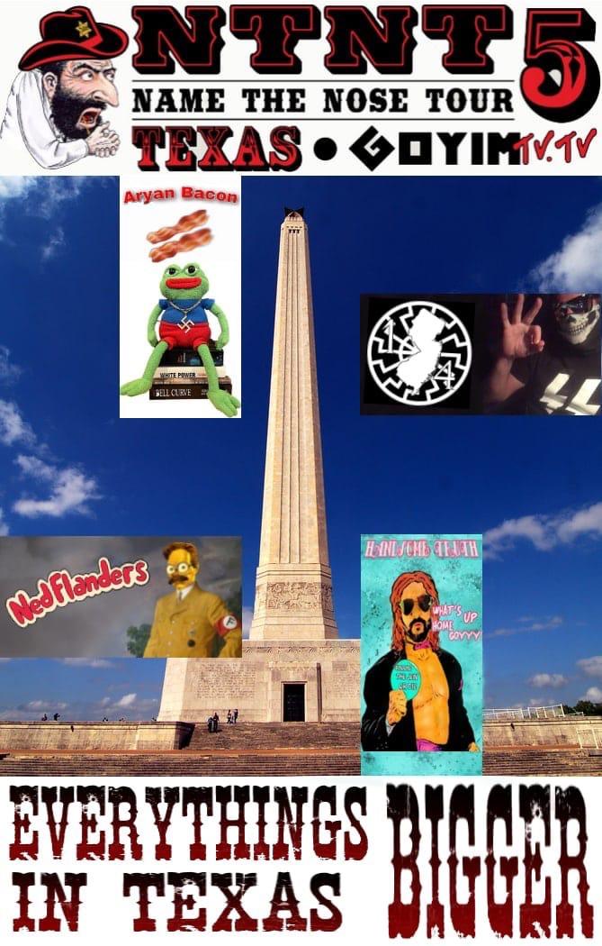 This past October, Texas residents were repeatedly harassed by Neo-Nazi group the “Goyim Defense League” and their fifth antisemitic propagandist “Name the Nose” tour. Organized by Jon Eugene Minadeo II “Handsome Truth”, a failed Bay Area actor/rapper and Nazi streamer, NTN5 saw numerous publicity stunts like “Hug a Nazi”, a freeway banner drop with the slogan “Vax the Jews” and several swastika burnings. Following the tour, an Austin synagogue was set on fire by Telegram nazi Franklin Barrett Sechriest, who if not connected directly to the GDL was likely emboldened by the week’s intensified and blatant Nazi street actions.