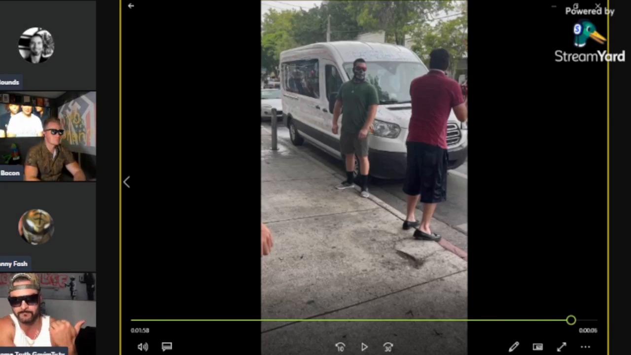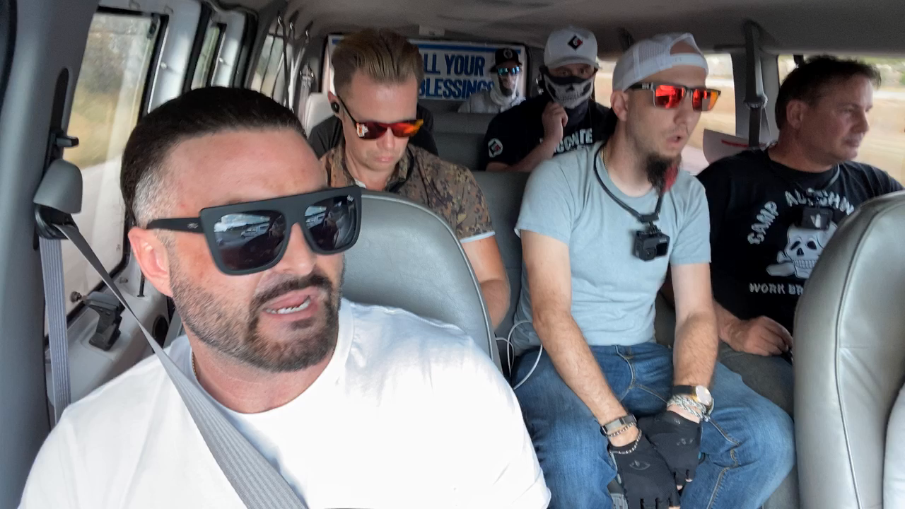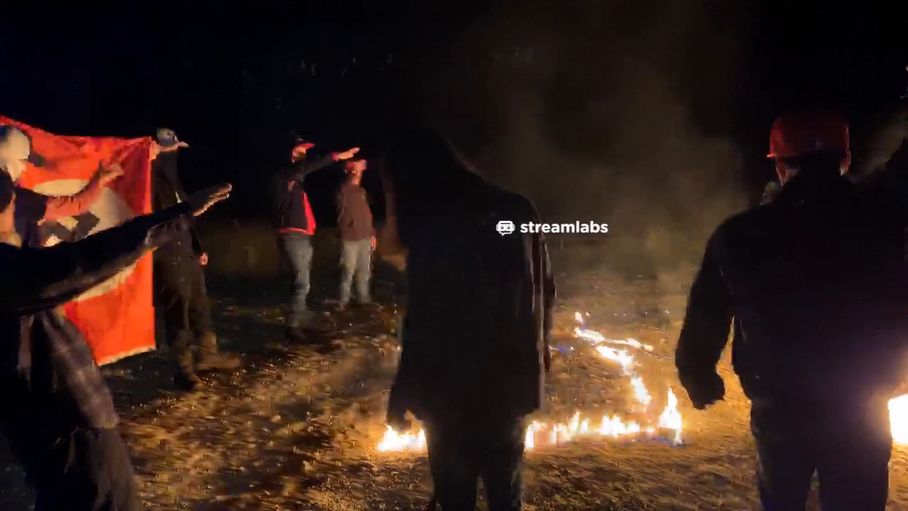 A swastika burning during “NTN5”From left to right; Jon Eugene Minadeo II of Petaluma, CA, Robert Frank Wilson of Chula Vista, CA, three as-of-yet unidentified GDL associates, and Jason Brown aka “14 Heart” of the New Jersey European Heritage Association wearing the Camp Auschwitz t-shirt. “Nationalist Ned Flanders” aka Dominic DiGiorgio (FL) is pictured off-screen driving.Colorado GDL member Joey Bounds streams with Robert Frank Wilson and Jon Minadeo recapping NTN4 in Florida which Wilson attended.