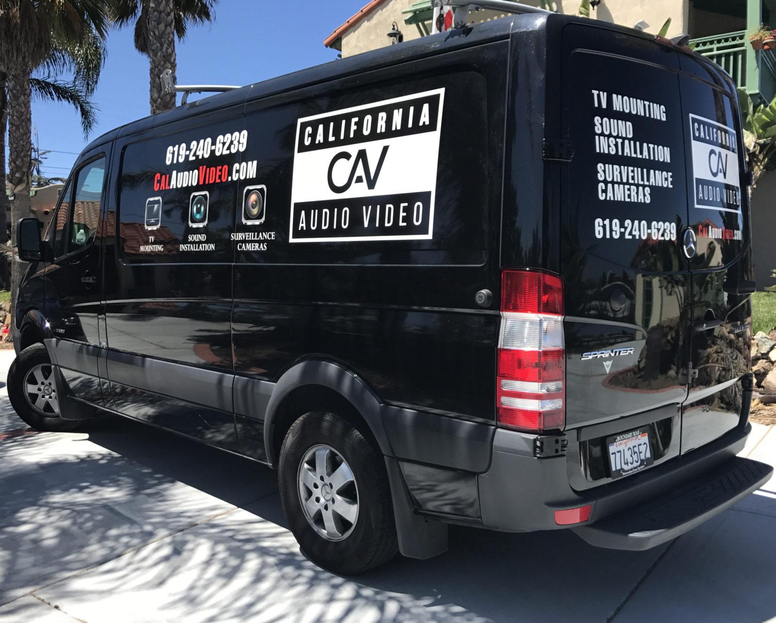 Vehicle: Black Mercedes-Benz Sprinter with California AV advertisements, CA Plate: 77435E2
