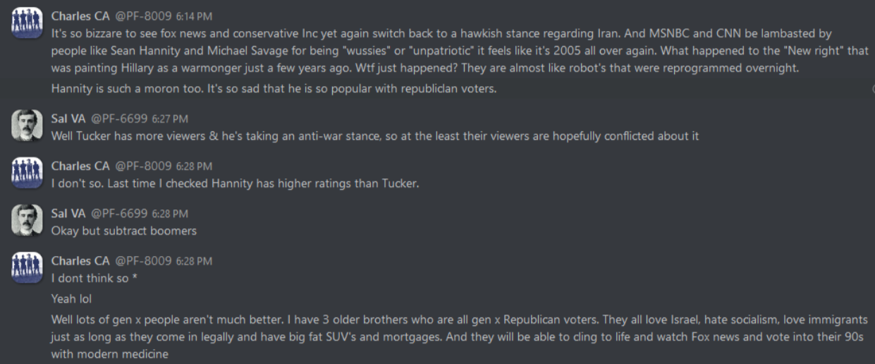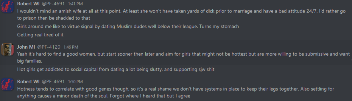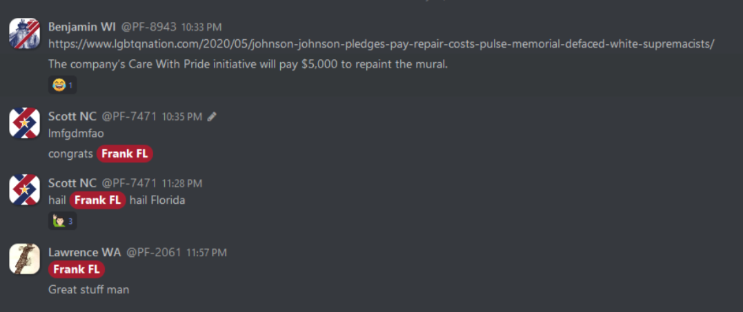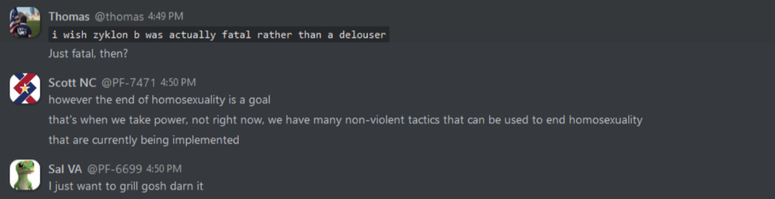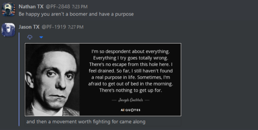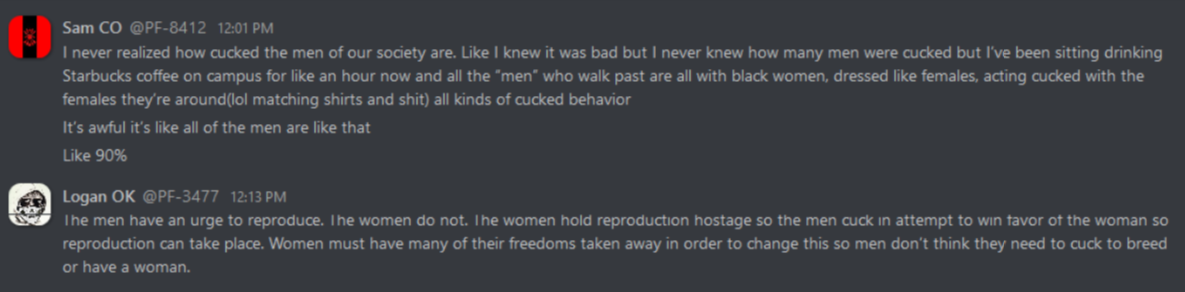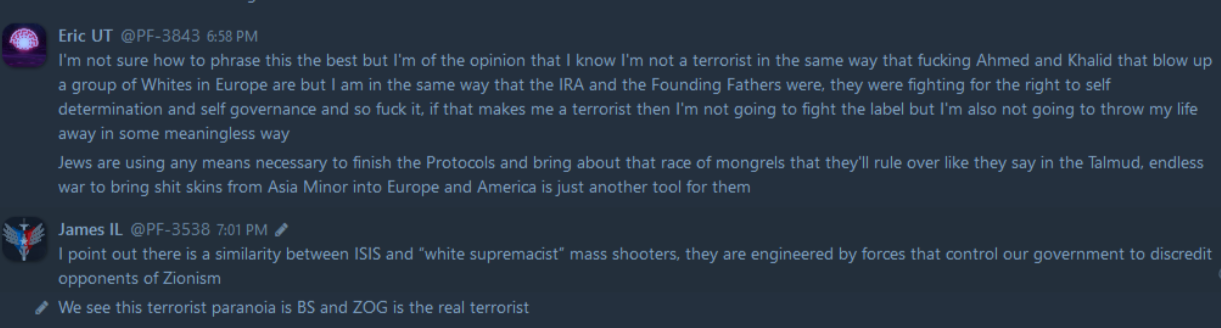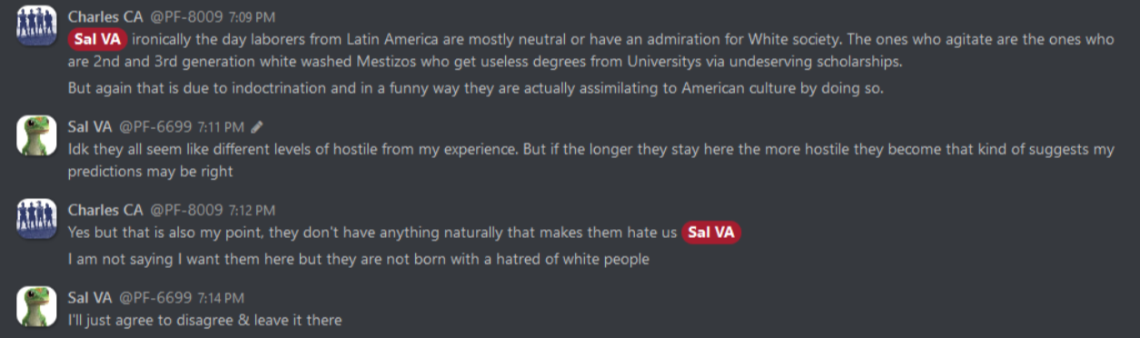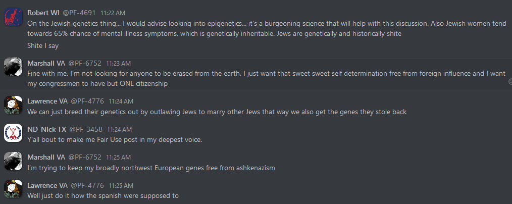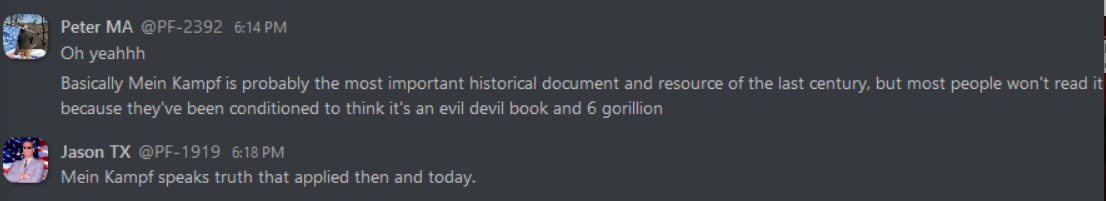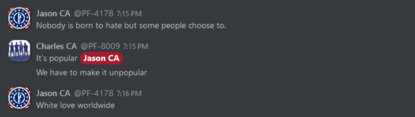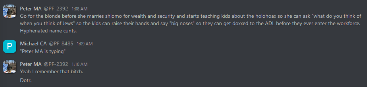 As can be expected, these internal discussions reveal everything that white nationalists hope to keep to themselves, from the banal to the totally horrific. From relationship advice between misogynist bros to Zionist conspiracy theories, anti-blackness and scapegoating of immigrant people, these chats reveal exactly what one would expect: a seventh grade lunch table of violent xenophobia. This isn’t surprising, coming from an organization whose primary accomplishment so far is being associated with killing someone rather famously in Charlottesville. In the three years since that damning day, Patriot Front’s leadership has tried desperately to steer the group toward some semblance of legitimacy and trustworthiness. To no avail, it seems – the group is lousy with deeply entrenched bigots and Mama’s basement Nazis of the worst order. The chats reveal the stark disparity between what they hope to convey to the general public, and what they’re actually about.
