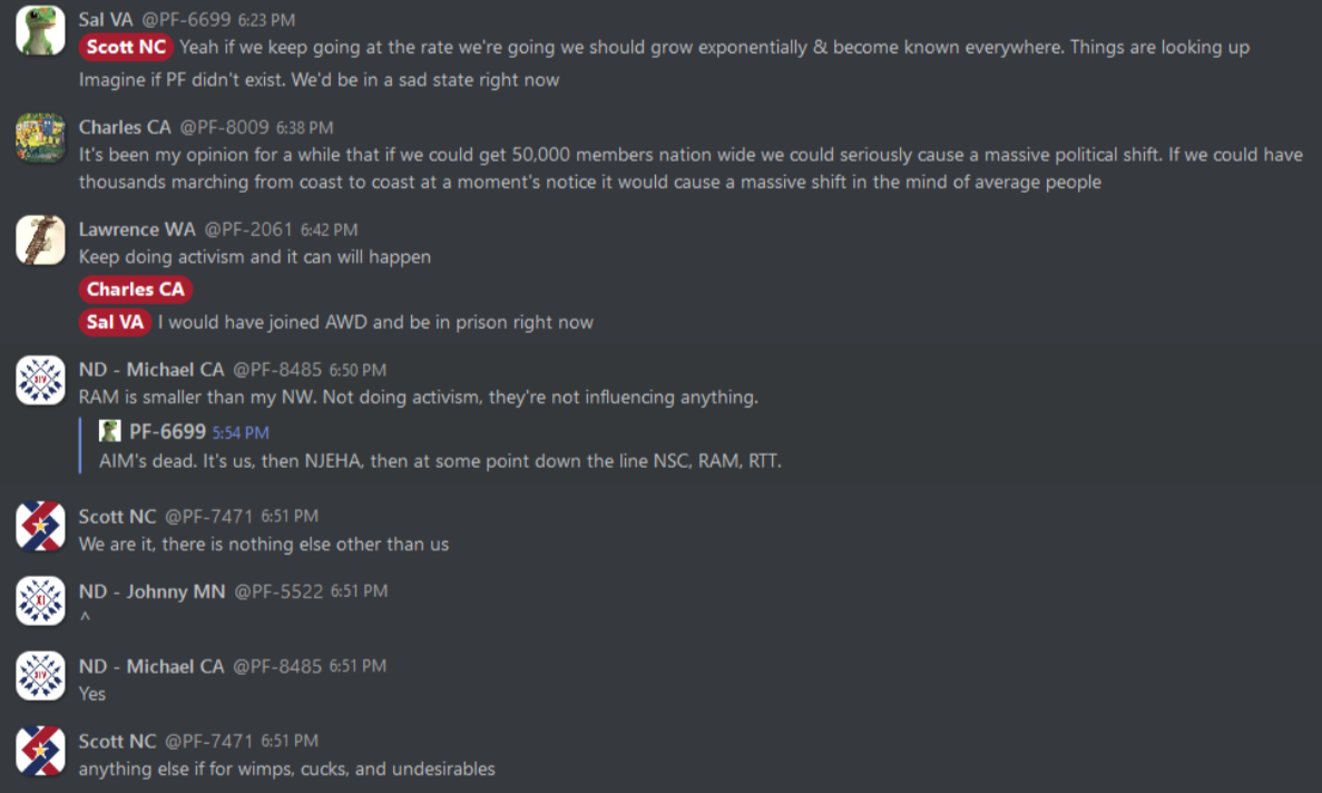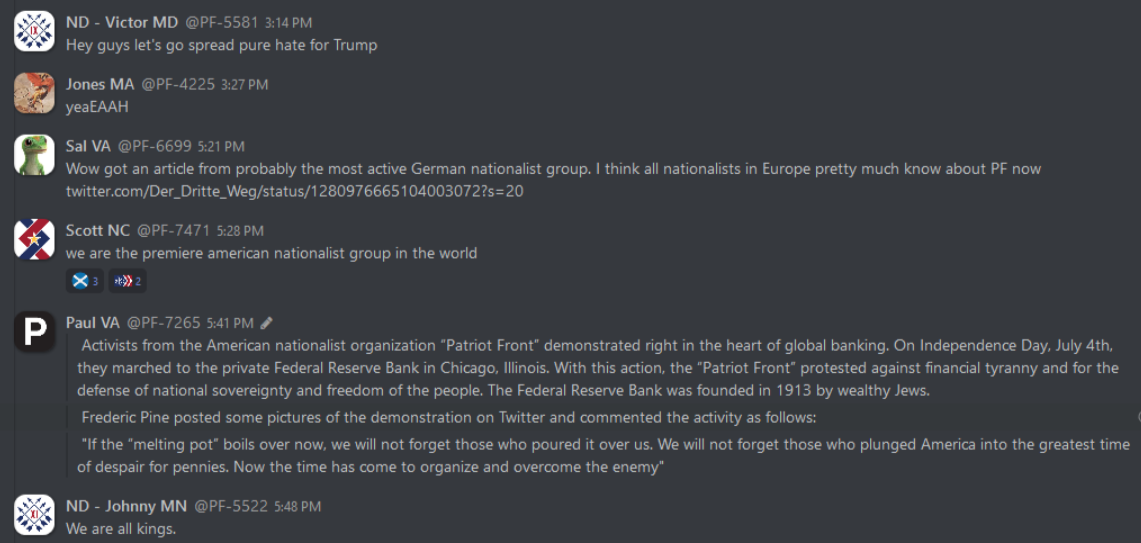 Recently the Torch Antifascist Network released 560+ leaked PDFs depicting over fifteen months of chat logs of Patriot Front’s “general” or membership-wide private RocketChat channel. To access these files and read their analysis by Torch Network antifascist comrades: