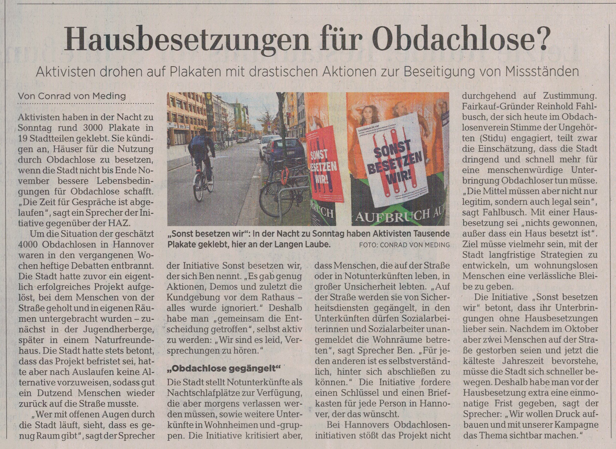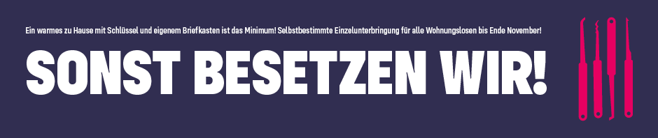 Trotz eines Gesprächsangebotes von Seiten der Besetzer_innen hat die Stadt Hannover sich dem Dialog verweigert und die Häuser räumen lassen. So ist es wieder nicht gelungen, Wohnraum für Wohnungslose zu erkämpfen. Wir sagen aber deutlich: Das ist erst der Anfang. Die Aktivitäten zur Erkämpfung würdiger Unterkünfte haben erst begonnen. Die Stadt Hannover macht sich etwas vor, wenn sie glaubt, sie könne verhindern, dass sich Wohungslose und solidarische Menschen zusammentun. Wir werden nicht tatenlos zusehen, wenn Menschen auf der Straße sterben, weil sie keine Unterkunft finden.