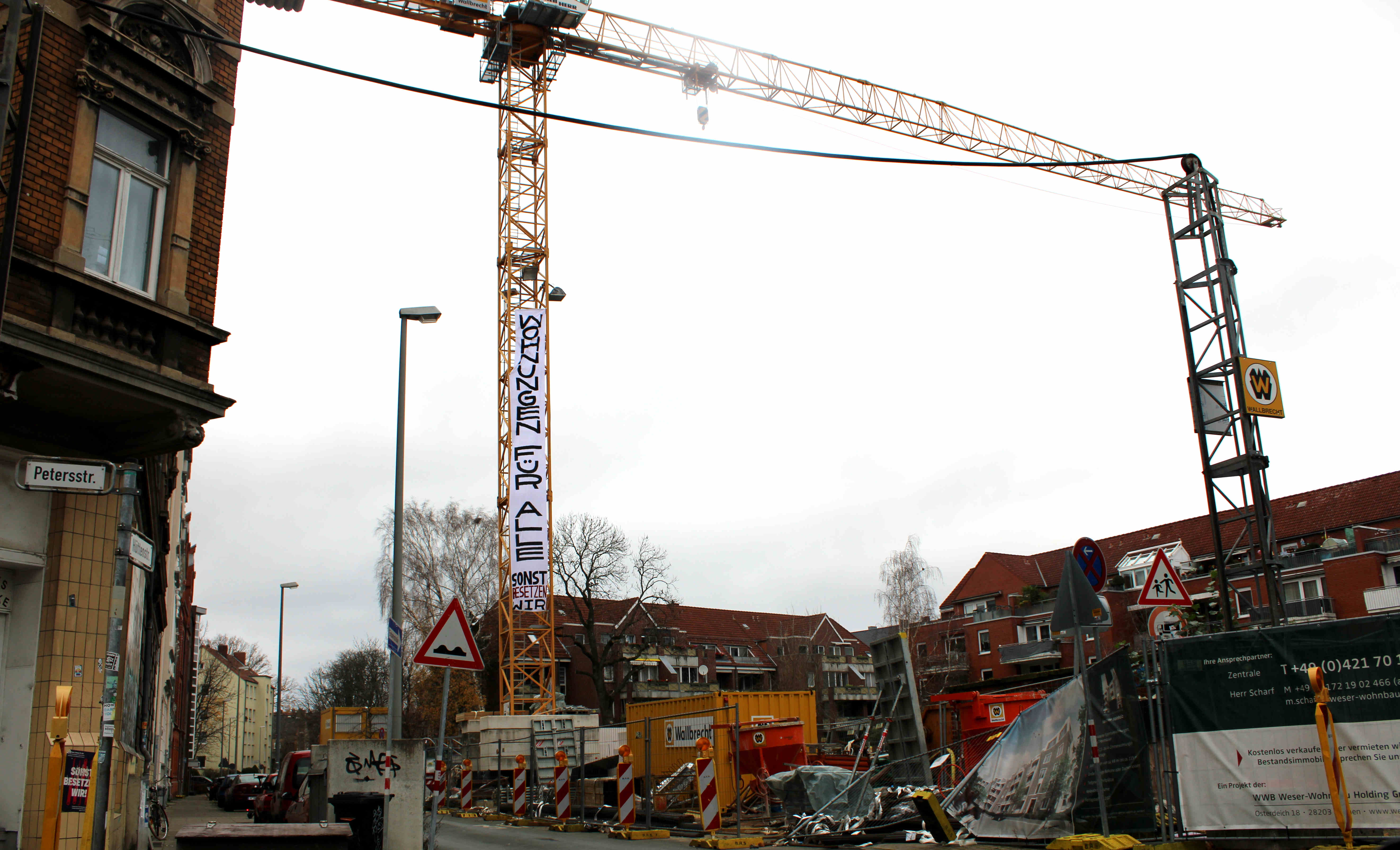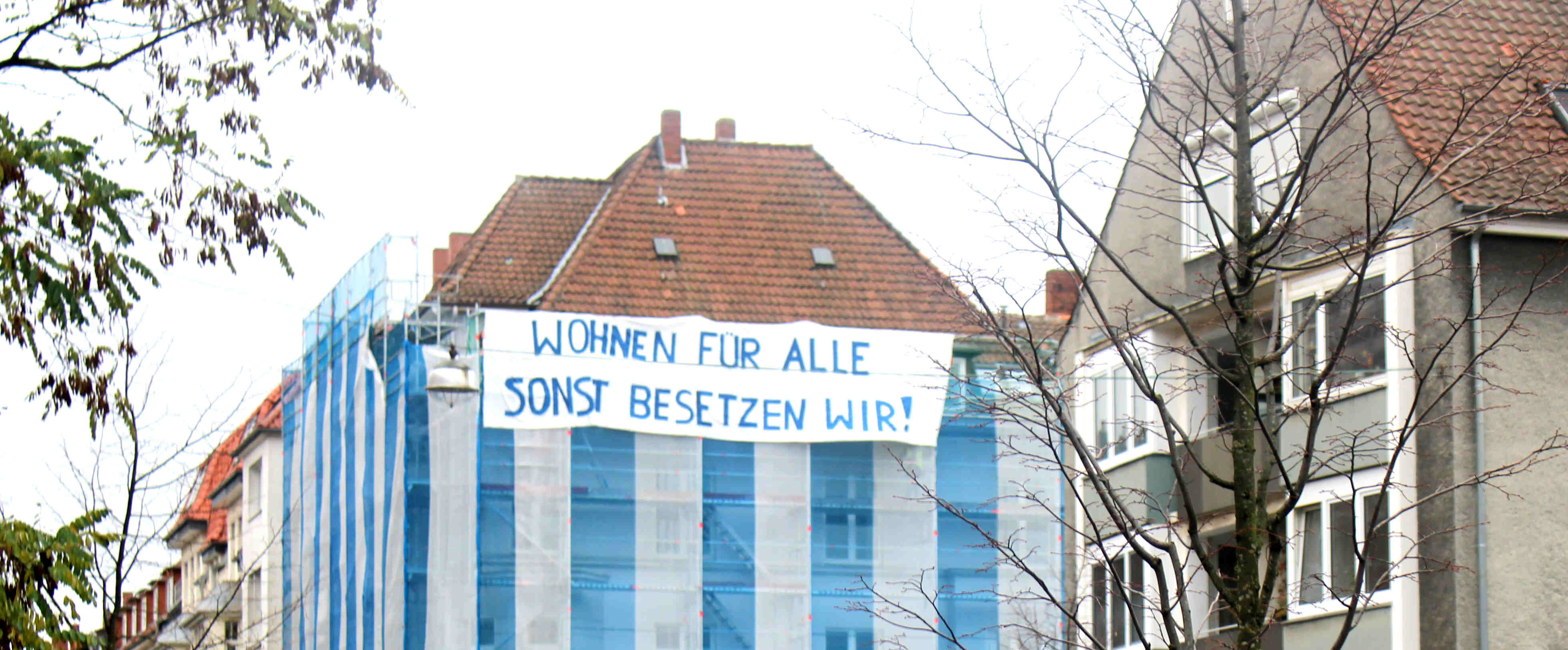 In Hainholz wurde ein großes Transparent am Baukran einer Baustelle angebracht: “Wohnungen für Alle – sonst besetzen wir!”