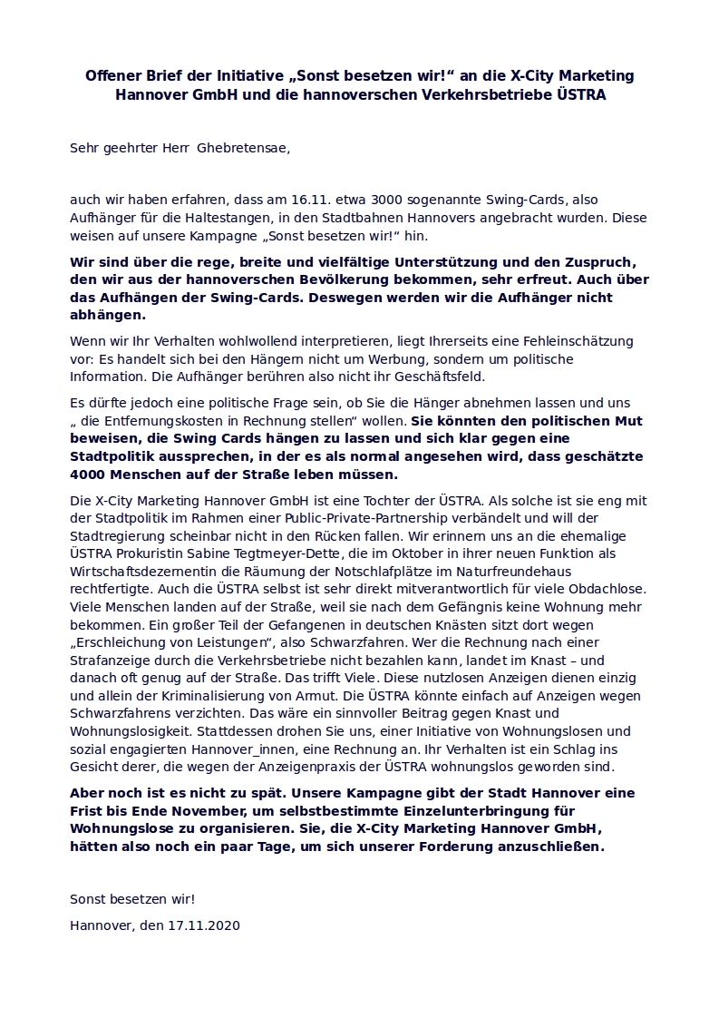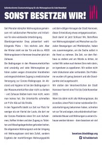 Wir forden die Stadt Hannover auf, den Strafantrag gegen die Aktivist_innen zurückzuziehen. Wenn die Stadtverwaltung glaubt, soziale Probleme und Konflikte polizeilich lösen zu können, wird sie weitere Teile der Bevölkerung gegen sich aufbringen. Daran haben wir keinen Zweifel.