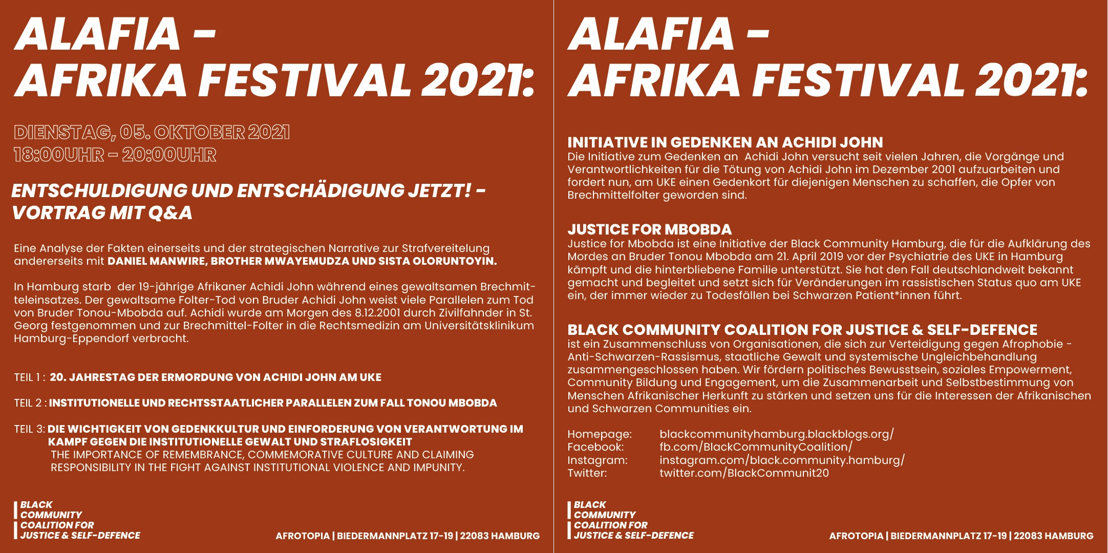 Rahmenprogramm der BLACK COMMUNITY Coalition for Justice & Self-Defence zum ALAFIA-AFRIKA FESTIVAL 2021
