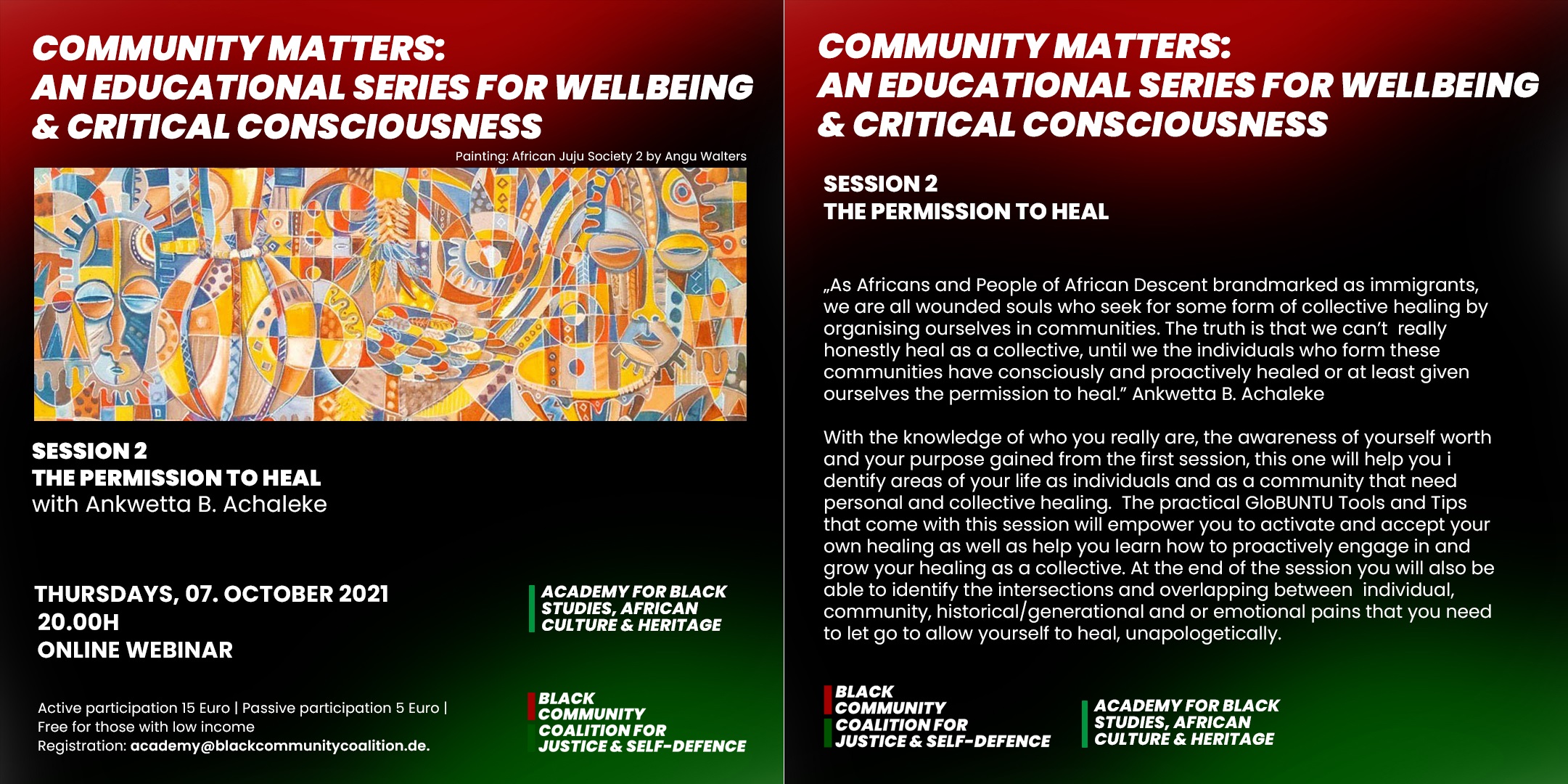 Sonntag, 19. Mai 2024 | 14:00 Uhr Gedenkfeier mit Liedern der Befreiung und Heilung – Orisa-Lieder und Befreiungslieder zur Förderung des spirituellen und gemeinschaftlichen Wohlbefindens. Anmeldung erforderlich ([email protected]) Der Veranstaltungsort wird durch die Anmeldung bekannt gegeben