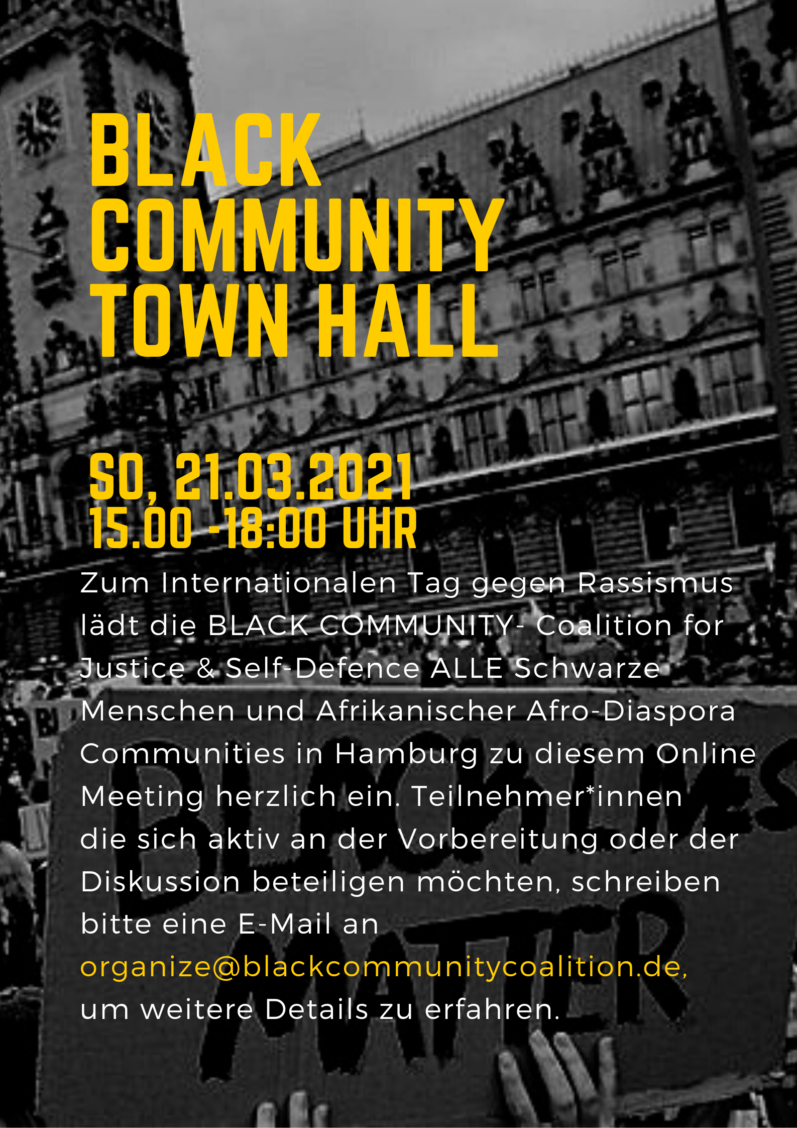 Die jüngsten Ereignisse der letzten Monate haben unsere Verpflichtung zur Gerechtigkeitsarbeit erneuert, um das Problem des Anti-Schwarzen und institutionellen Rassismus mit einer Strategie einem strukturierten Dialog und Rechenschaftspflicht anzugehen. Die BLACK COMMUNITY Coalition steht auf dem Standpunkt, dass Rassismus systemisch wirkt und Institutionen, Behörden und Medien, die ihn zulassen und nutzen, ihn viel zu lange verleugnet haben. Dieses Town-Hall-Meeting soll ein weiterer Schritt sein, um den anhaltenden Anti-Schwarzen Rassismus zu benennen und aufzuzeigen, wie er sich auf Menschen und Familien Afrikanischer Herkunft auswirkt. Wir möchten das Prinzip von „Community Connect“ reaktivieren, um stärkere Beziehungen untereinander aufzubauen und uns so zu koordinieren, dass wir unsere Bemühungen zur Bekämpfung von Rassismus und Diskriminierung verstärken können. Dieses virtuelle Town-Hall-Meeting soll insbesondere auch Raum für die Schwarzen Menschen in Hamburg bieten, die sich bis jetzt noch nicht ausgetauscht haben.
