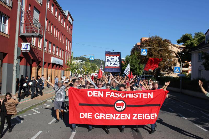 Ab 14 Uhr versammelten sich zahlreiche Aktivist*innen vor dem Rheincenter in Friedlingen. Ein Stand bot die Möglichkeit sich über lokale Nazistrukturen und antifaschistische Inhalte zu informieren. Gegen 14:30 formierte sich die Demonstration und zog zum Hüningerplatz, wo die OAT aus Basel und Schopfheim in einer gemeinsamen Rede die lokale Situation und Hintergründe des Protestes aufzeigten. Daraufhin setzte sich der Demozug entschlossen und kämpferisch in Bewegung, Pyrotechnik wurde gezündet und stoppte für den nächsten Redebeitrag am Kreisverkehr vor der Einkaufsinsel in Weil. Verschiedene Antifagruppen aus Baden-Württemberg verdeutlichten in ihrer Rede die Notwendigkeit städteübergreifender Vernetzung und einer linken Perspektive, um dem europaweiten Rechtsruck entgegentreten zu können. Die Demo wurde bis zum Berlinerplatz fortgesetzt, auf der gesamten Strecke wurden interessierte Passant*innen auf die regionale Situation aufmerksam gemacht und mehrere schlossen sich dem Protestzug an. Auf dem Berlinerplatz nutzte der Revolutionäre Aufbau Basel die Möglichkeit darauf hinzuweisen, dass ein konsequenter Antifaschismus notwendiger Weise mit fundamentaler Kritik am kapitalistischen Wirtschaftssystem verknüpft ist.