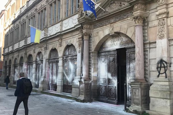 Am Place Gutenberg muss ein einzelner Bulle mit ansehen, wie zuerst die dortige HSBC Filiale und danach die „Chambre de commerce et d’industrie“ attackiert wurden. Letztere wurde von oben bis unten mit einem Feuerlöscher eingedeckt. „Die Reinigung von Sandstein ist richtig aufwändig und beschissen“, merkt eine Gefährtin, beim Vorüberziehen lächelnd an.