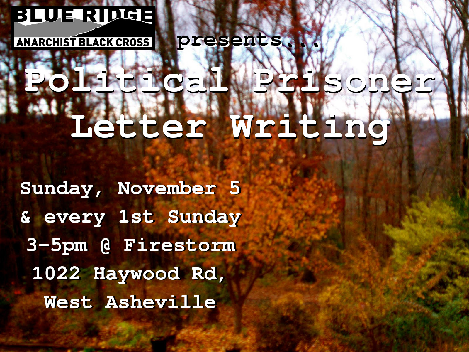 "Blue Ridge Anarchist Black Cross" logo + "presents... Political Prisoner Letter Writing | Sunday, November 5 & every 1st Sunday, 3-5pm @ Firestorm, 1022 Haywood Rd, West Asheville" text overlaid over blurry picture of trees with autumnal leaves