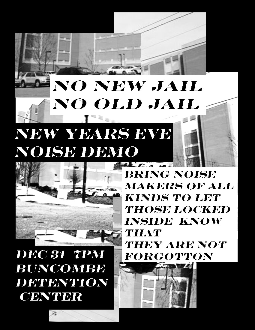 On Sunday, 12/31/17 at the downtown county jail and courthouse complex, a noise demonstration will happen at 7pm to bring outside attention to the jail and let the folks on the inside know that we’re thinking of them. Bring noisemakers, pots, pans, horns, whatever.