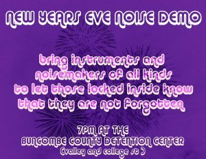 Join folks from around the area to engage this yearly tradition to make some noise to ring in the New Year outside the Buncombe County Jail at 7pm, Monday December 31st! A noise demo means bring layers (gonna be chilly), bring noisemakers, bring a buddy and let folks inside the jail know people outside are thinking about them. Everything can change on a New Years Day!