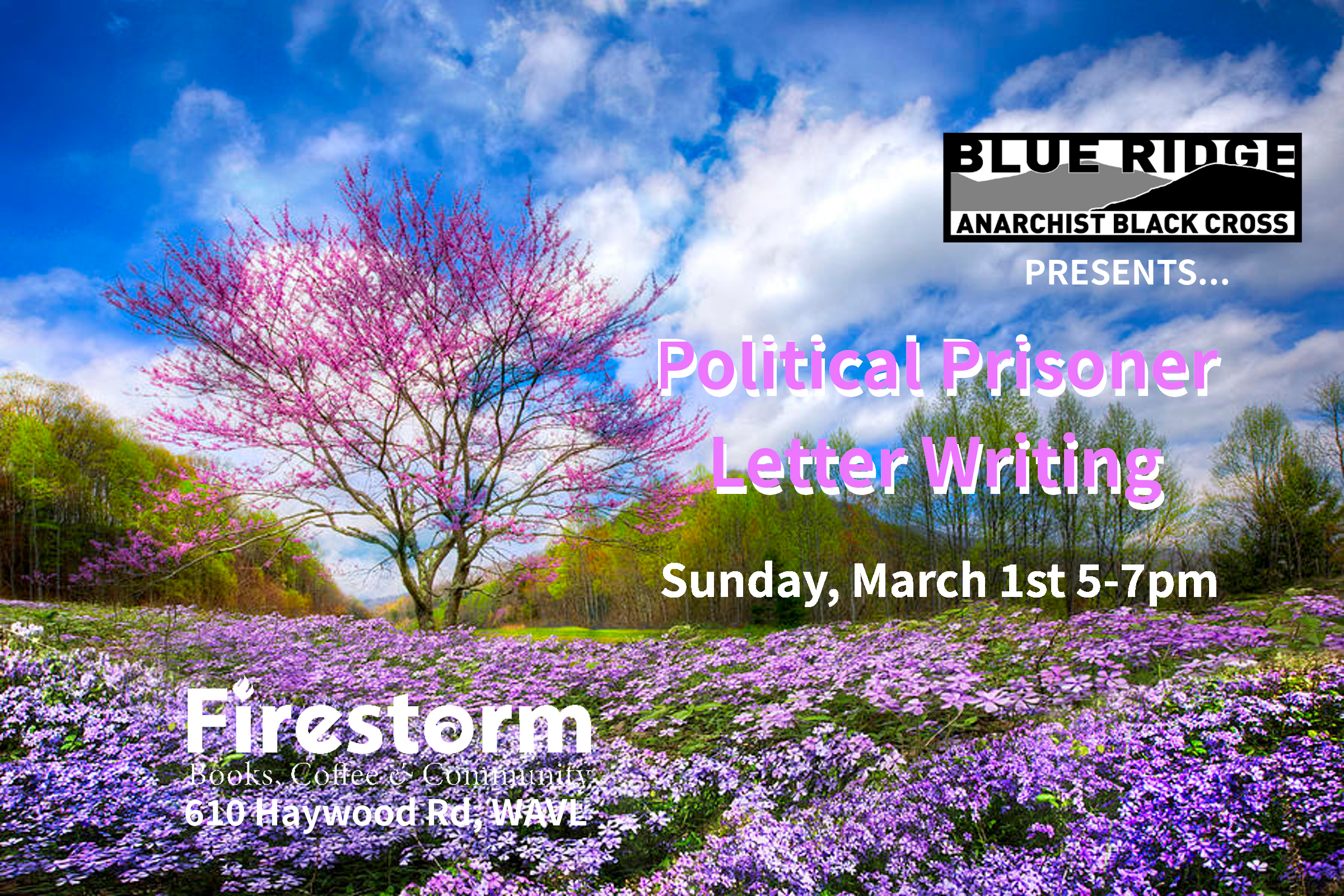 Join Blue Ridge ABC at Firestorm Books from 5-7pm, Sunday March 1st.  We’ll be writing political prisoners in the US with upcoming birthdays and prisoners facing repression for organizing and speaking out behind bars.
