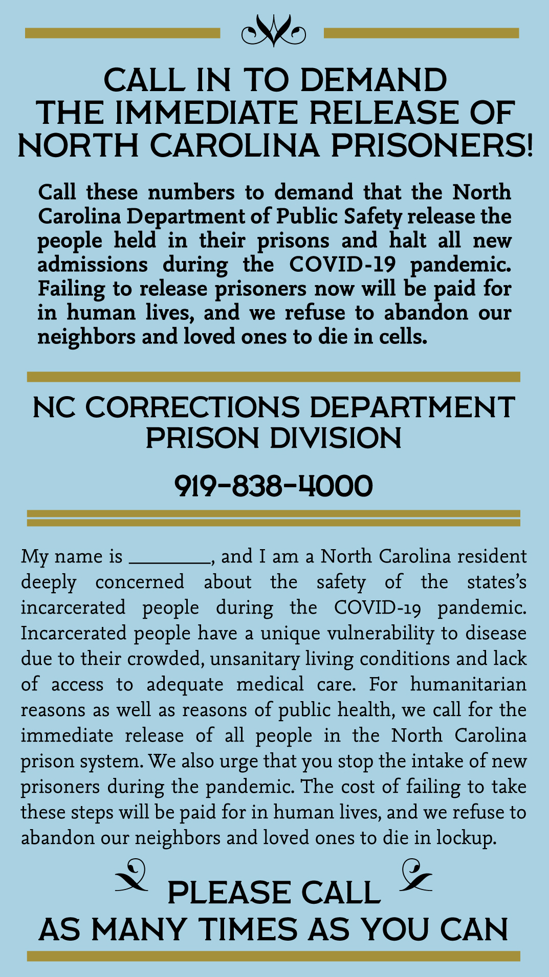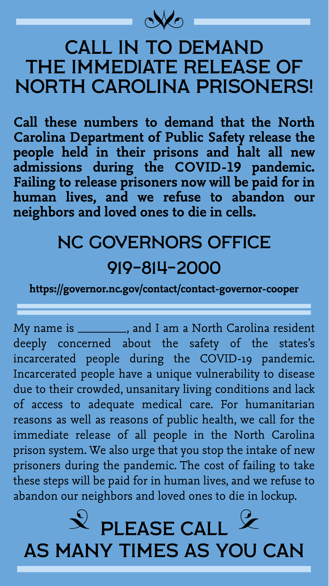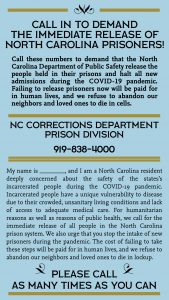 Monday, March 23rd 2020, folks are encouraged to flood the phone lines of the North Carolina Department of Public Safety and demand the release of all prisoners due to the mismanagement, lack of preparedness, lack of access to free sanitary living conditions for it’s wards in this time of Covid-19 pandemic.  You can call Governor Cooper at 919-814-2000 and you can call the NCDPS at 919-838-4000.  More info forthcoming, including demands to release all prisoners at the infamous Durham County Jail, from @emptycagescoll and @ncresists on twitter.