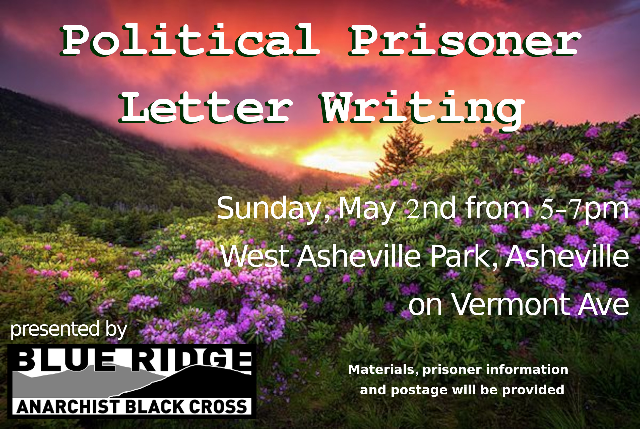Join us on May 2nd from 5-7pm at West Asheville Park (Vermont Ave, Asheville) for our monthly, socially distanced letter writing events. We’ll provide materials, names of prisoners with upcoming birthdays or facing repression who could use a kind word, potential friends and comrades. Letters not only bridge connection through the bars, they provide a shield of recognition to people living in cages. Or just come by with your own writing project for a collective hangout if you’d like.