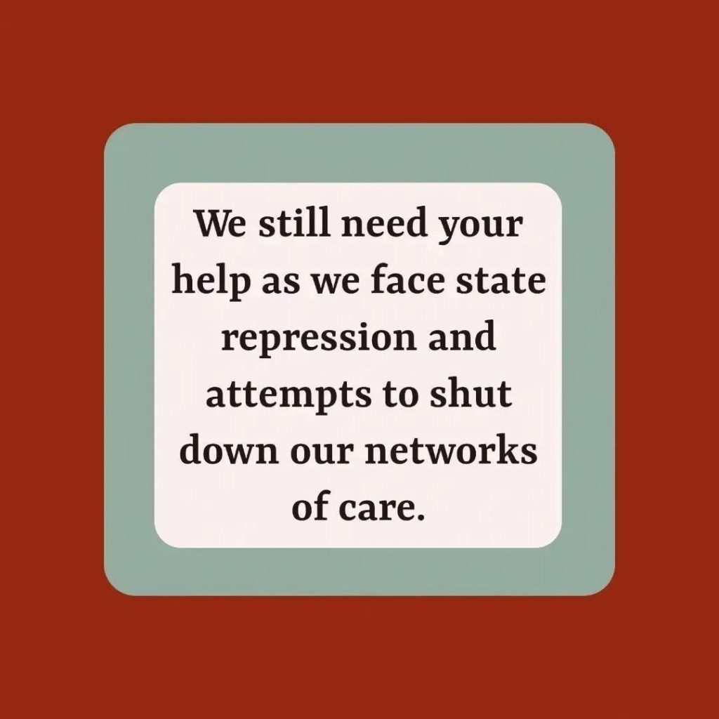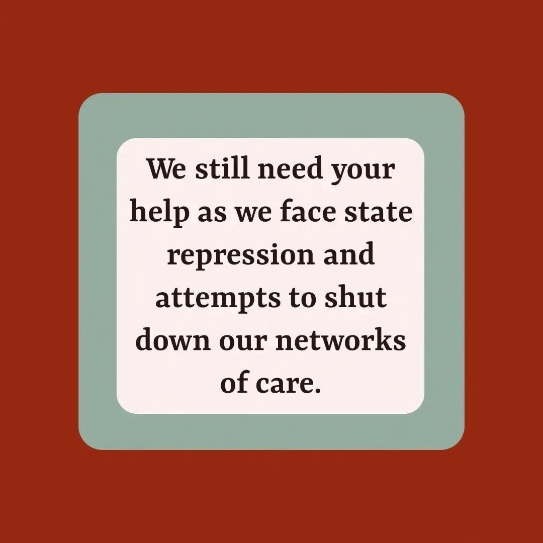 Slide Seven: Black text on white background reading: ” We still need your help as we face state repression and attempts to shut down our networks of care. ” with a blue border and dark red background.