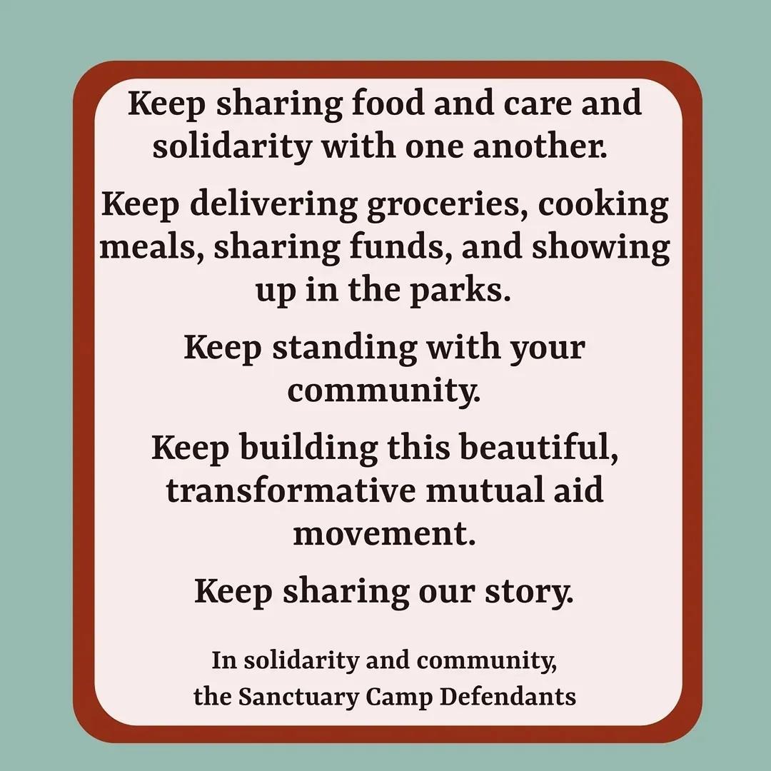 Slide eight: Black text on light red background reading: “Keep sharing food and care and solidarity with one another. Keep delivering groceries, cooking meals, sharing funds, and showing up in the parks. Keep standing with your community. Keep building this beautiful, transformative mutual aid movement. Keep sharing our story. In solidarity and community, the Sanctuary Camp Defendants” with a dark red border and light blue background.