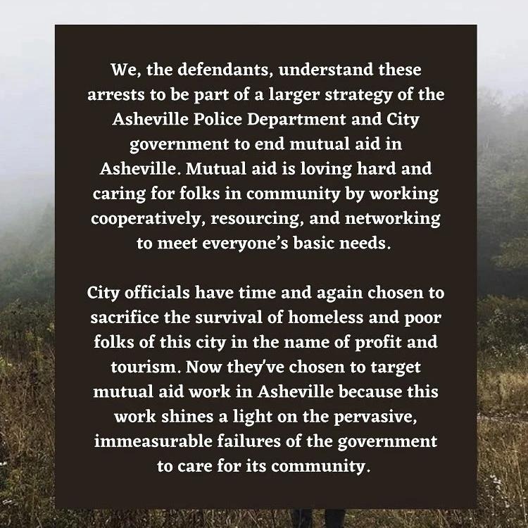 “We, the defendants, understand these arrests to be part of a larger strategy of the Asheville Police Department and City government to end mutual aid in Asheville. Mutual aid is loving hard and caring for folks in community by working cooperatively, resourcing, and networking to meet everyone’s basic needs. City officials have time and again chosen to sacrifice the survival of homeless and poor folks of this city in the name of profit and tourism. Now they’ve chosen to target mutual aid work in Asheville because this work shines a light on the pervasive, immeasurable failures of the government to care for its community.”