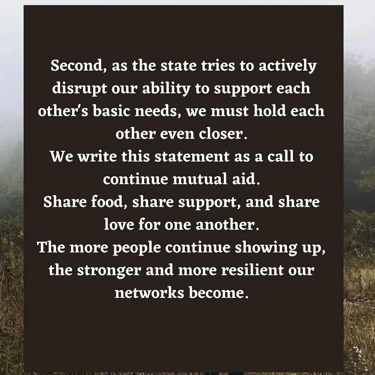 “Second, as the state tries to actively disrupt our ability to support each other’s basic needs, we must hold each other even closer. We write this statement as a call to continue mutual aid. Share food, share support, and share love for one another. The more people continue showing up, the stronger and more resilient our networks become.”