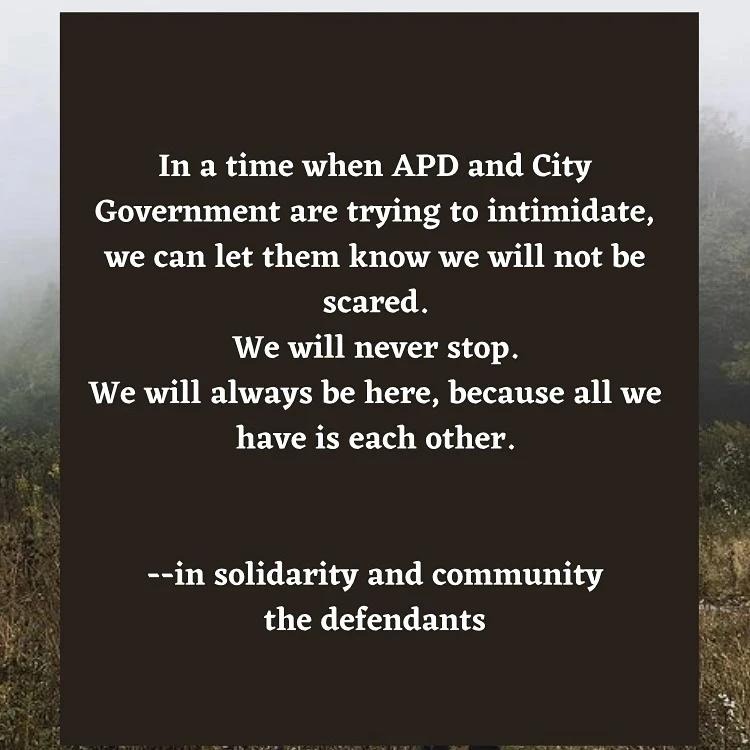 “In a time when APD and City Government are trying to intimidate, we can let them know we will not be scared. We will never stop. We will always be here, because all we have is each other. –in solidarity and community the defendants”