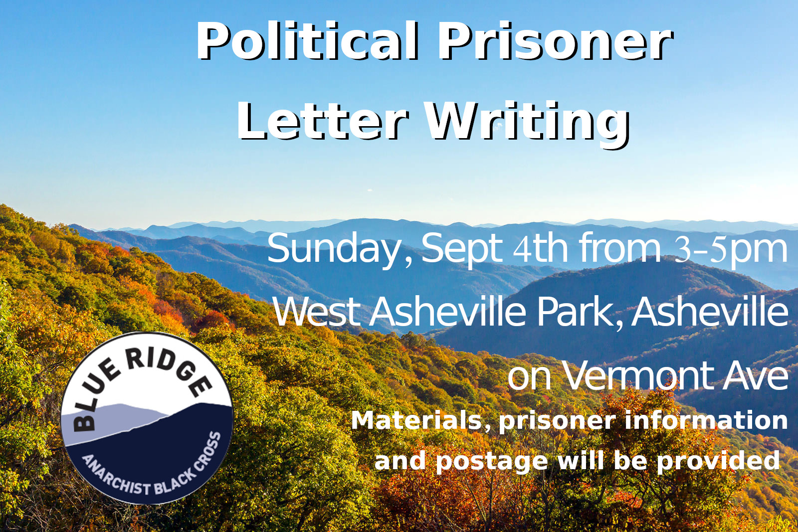 Join Blue Ridge ABC for political prisoner letter writing, Sunday Sept 4th from 3-5pm at West Asheville Park, 198 Vermont Ave. We’ll be writing to political prisoners with upcoming birthdays as well as any friends or loved ones who may need a little boost behind bars. Pick up free literature and stickers, make some friends, possibly learn how to write a letter and acquaint yourself to someone behind bars.