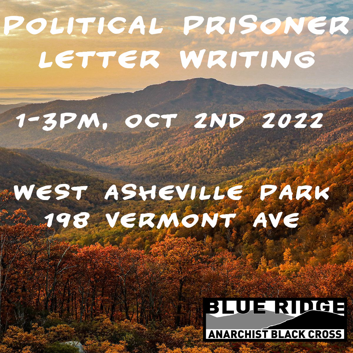 From 1-3pm, join us for our monthly letter writing event at West Asheville Park, 198 Vermont Avenue. Get free information about political prisoners, we’ll bring letter writing supplies, talk about abolitionism. You know the deal! We’ll be writing to prisoners facing repression or with October birthdays, but feel free to bring those letters you’ve set aside for a while, this is a great time to sit down and finally write it!