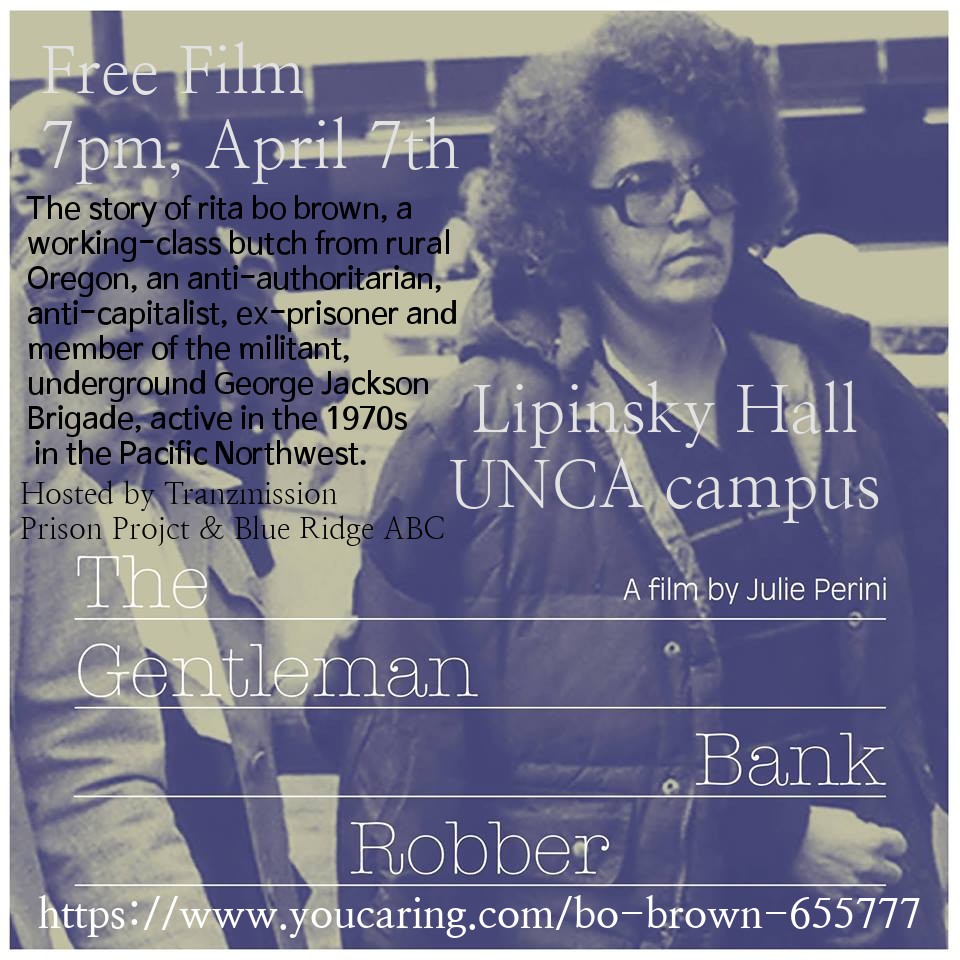 To cap off the weekend of the UNCA Queer Studies Conference on “Prisons, Borders and Pipelines: Toward a Queer Abolitionist Movement”, Blue Ridge ABC & Tranzmission Prison Project will be presenting a documentary film entitled “The Gentleman Bank Robber: The Story of Butch Lesbian Freedom Fighter rita bo brown.”