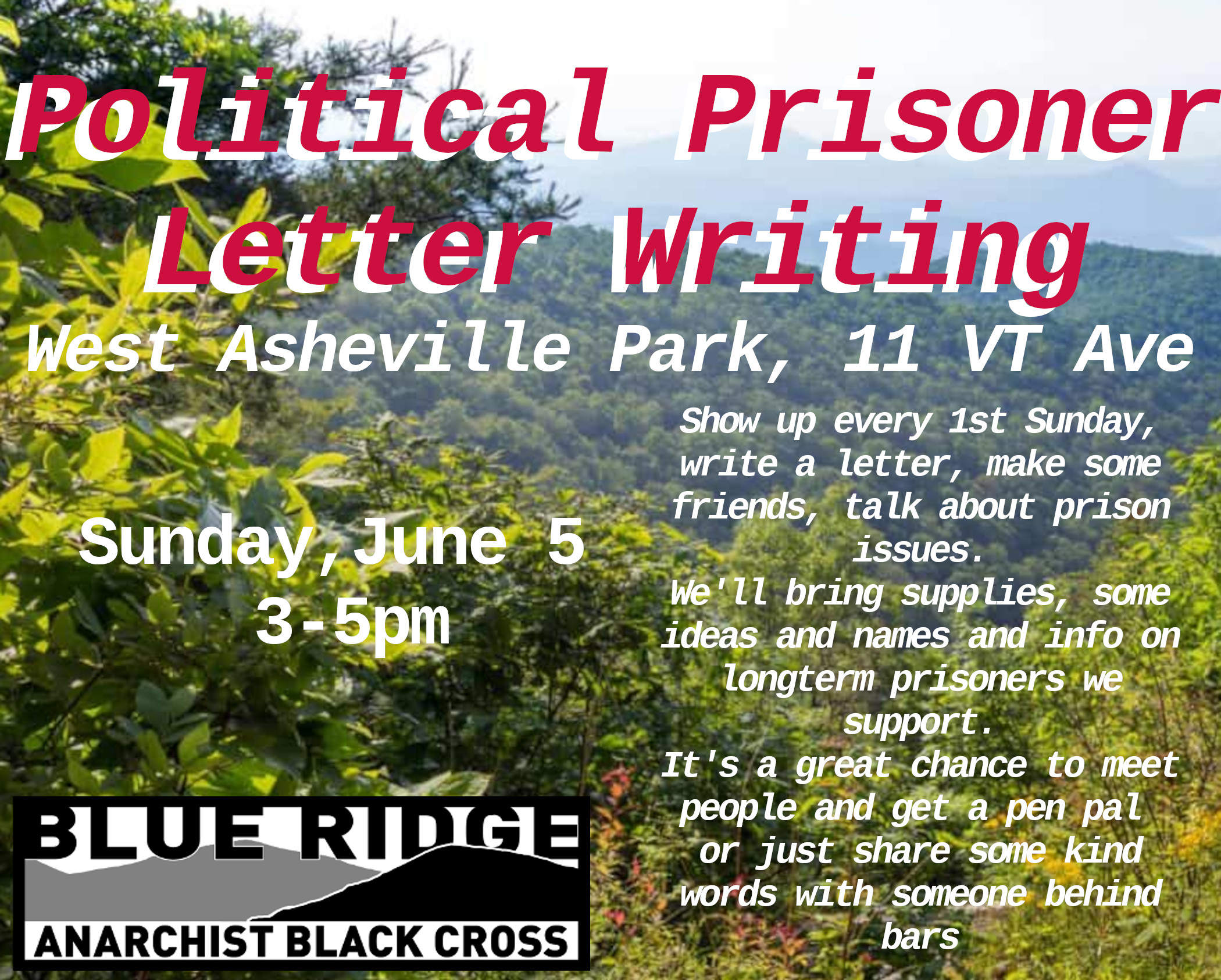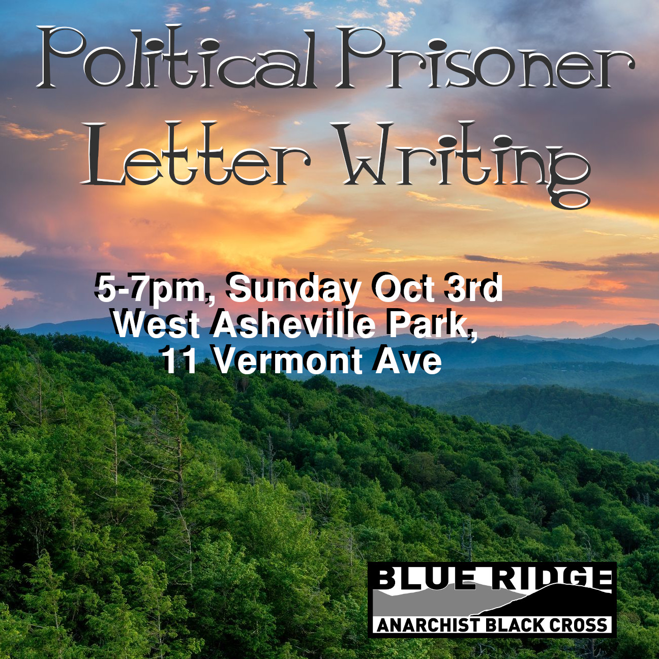 If you’re in the Asheville area, check out the Blue Ridge Anarchist Black Cross letter writing night on Sunday, November 7th from 5-7pm at West Asheville Park at 198 Vermont Ave. No letter writing experience required, they provide stationary, names and addresses of prisoners with upcoming birthdays or facing repression.