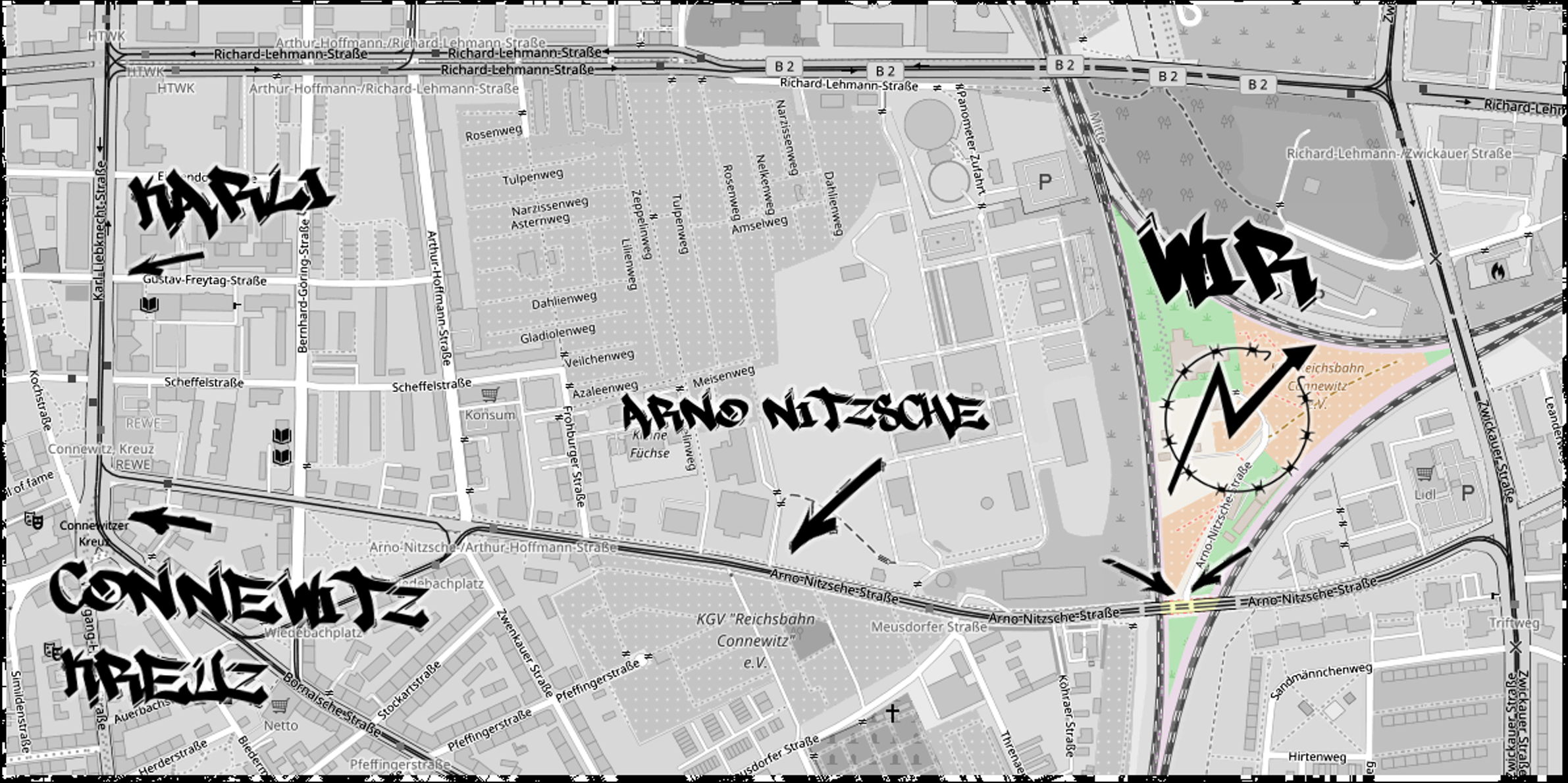 Die Tram 10 fährt fast vor unsere Haustür. Steigt an der Haltestelle Meusdorfer Str. aus. Gegenüber von der Tankstelle ist rechts neben den Schienen ein kleiner Pfad. Den lauft ihr runter und in 1 MInute steht ihr vor einem verbarikadiertem Tor – mittlerweile auch mit funktionierender Klingel rechts von der Tür. Benutzt sie … Alternativ koennt ihr auch mit der Tram 16 zum Triftweg fahren. Geht zur Kreuzung und sucht das Flugzeug. Sowohl die 10 als auch die 16 fahren direkt vom Hauptbahnhof.