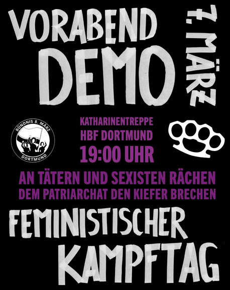 Auch dieses Jahr rufen wir, das Bündnis 8. März Dortmund, euch zum Feministischen Kampftag auf! Am 7. März werden wir gemeinsam als Vorabenddemo am Donnerstag den 7. März 2024 um 19h auf die Straße gehen und unter dem Motto An Tätern und Sexisten rächen, dem Patriarchat den Kiefer brechen! ein Zeichen setzten