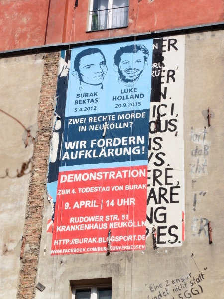 Am 5. März 2016 wurde ein Wandbild/Mural am Görlitzer Bahnhof mit der Aufschrift “Burak Bektaş und Luke Holland – Zwei rechte Morde in Neukölln? WIR FORDERN AUFKLÄRUNG! – Demonstration zum 4. Todestag von Burak am 9. April 2016 – 14 Uhr – Rudower Str. 51 – Krankenhaus Neukölln” aufgehängt.