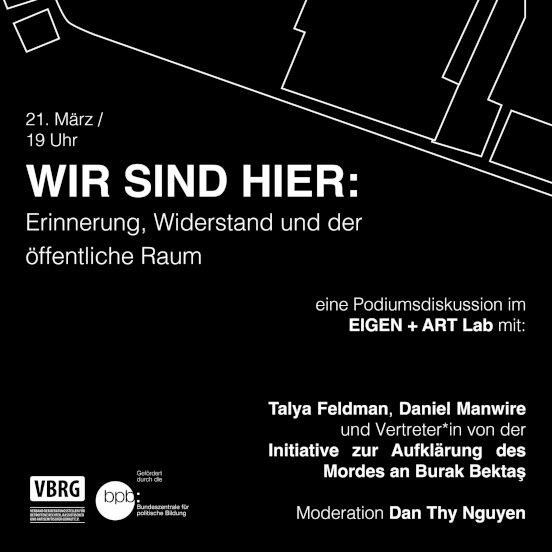 Am Dienstag, den 21. März um 19 Uhr findet eine Podiumsdiskussion zum Thema _Erinnerung, Widerstand und der öffentliche Raum_ mit der Künstlerin Talya Feldman und den WIR SIND HIER Projektmitarbeiter*innen: Daniel Manwire (Initiative in Gedenken an Yaya Jabbi) und Vertreter*in von der Initiative zur Aufklärung des Mordes an Burak Bektaş statt.