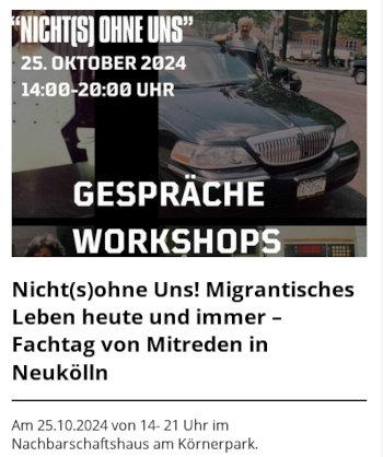 Im Rahmen des Events Nicht(s) ohne uns! – Migrantisches Leben heute und immer am 25.10.2024 im Nachbarschaftshaus am Körnerpark (Schierker Str. 53, 12051 Berlin) von 14 bis 21 Uhr, halten die Agentur für soziale Perspektiven und die Burak-Ini einen Workshop von 16:30 bis 19 Uhr.