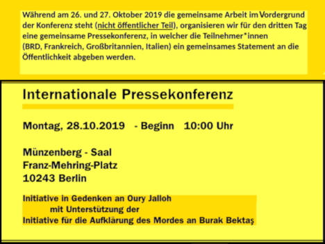 Während am 26. und 27. Oktober 2019 die gemeinsame Arbeit im Fordergrund der Konferenz steht (nicht öffentlicher Teil), organisieren wir für den dritten Tag eine gemeinsame Pressekonferenz, in welcher die Teilnehmer*innen (BRD, Frankreich, Großbritannien, Italien) ein gemeinsames Statement an die Öffentlichkeit abgeben werden.