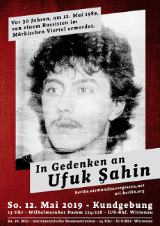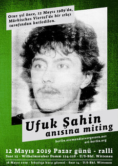 Ufuk Şahin için hala bir anma günü yok. Bunu değiştirmek istiyoruz. 30. Ölüm yıldönümünde Ufuk Şahin’i anmak istiyoruz. Sizlerle beraber 12.05.2019 tarihinde saat 13: 00’de Wilhelmsruher Damm 224’e yürüyüşü protestosu düzenlemek istiyoruz.