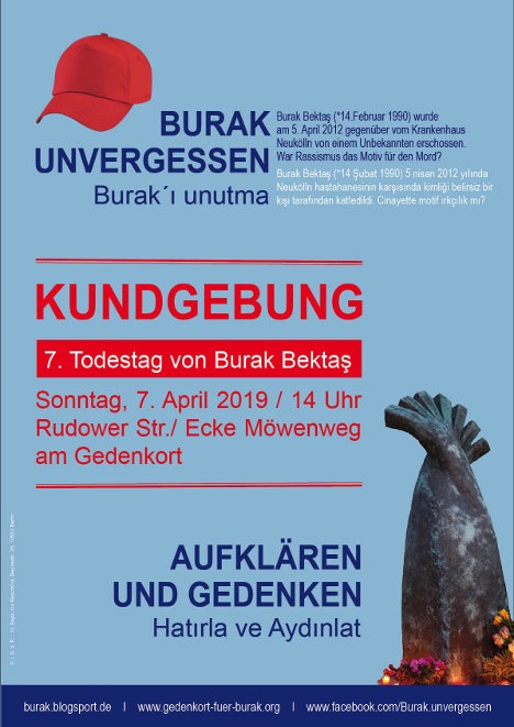 Am 7. April um 14 Uhr seit ihr eingeladen zur Kundgebung “Gedenken und Aufklären” zum 7. Jahrestag des Mordes an Burak Bektaş, war Rassismus das Motiv?