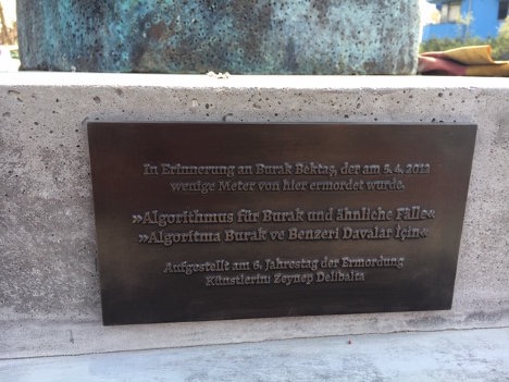 Gestern wurde an der Skulptur des Gedenkort Burak Bektaş die Inschrift von unserer inzwischen verstorbenen Künstlerin Zeynep Delibalta „Algorithmus für Burak und ähnliche Fälle“ angebracht.