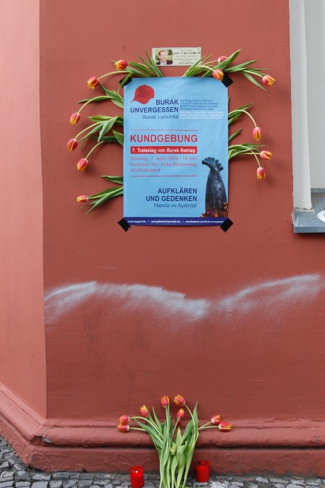 Wir treffen uns immer an Buraks Geburtstag an dieser Stelle oder am Ort seines Todes, um zu erinnern und um anzuklagen: Findet seinen Mörder! So schrieb es Melike, seine Schwester schon auf ein Plakat.