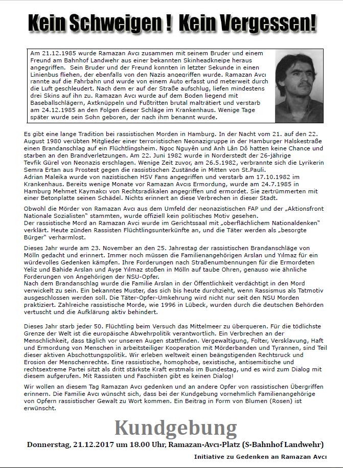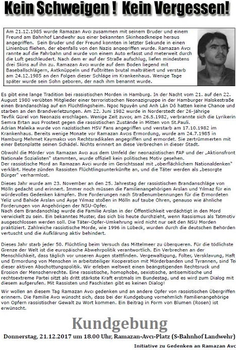 At the 19th Novembre 2017 together with more than 500 people we remembered at the Berlin theater “HAU Hebbel am Ufer” Yeliz Arslan, Ayşe Yılmaz and Bahide Arslan who were killed 25 years ago at the racist arson in Mölln 1992, as well as Burak Bektaş, Süleyman Taşköprü, Oury Jalloh and all other victims of racist violence. “We are not extras, but witness” (Ibrahim Arslan) and not only witnesses, but accusing against racism in this society. We remember, and at the same time, we fight for another society. It was very moving with all of you. Thank you very much!