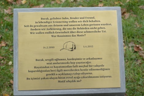100 Menschen weihten am 5. November am Gedenkort Burak Bektaş die Gedenktafel ein. Zum 6. Todestag von Burak Bektaş am 6. April 2018 soll die Skulptur des Gedenkortes errichtet werden. Hierfür brauchen wir noch Spenden – Spendet unter Betterplace-Gedenkort-Burak.