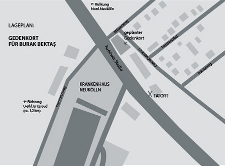 Die Neuköllner BVV beschloss auf ihrer gestrigen Sitzung mit den Stimmen von SPD, Grüne, Piraten und Linke das Bezirksamt anzuweisen, eine Nutzung der Grünfläche Rudower Straße Ecke Laubsängerweg durch die Initiative für die Aufklärung des Mordes an Burak Bektaș zu prüfen.