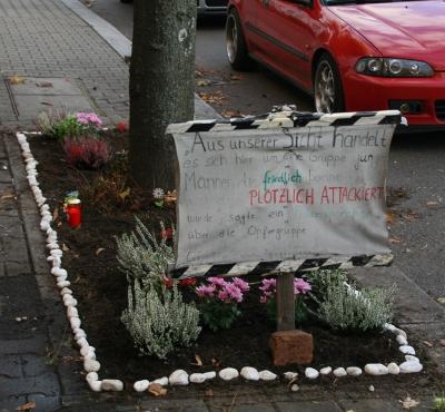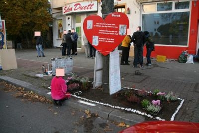 Am 18. Oktober 2013 haben wir die Gedenkstätte an den unfassbaren Mordanschlag auf Burak und Alex A. und Jamal A. (die beide lebensgefährlich verletzt überlebten) vor dem Neuköllner Krankenhaus repariert. In der Nachbarschaft wurde ein weiteres Mal Flugblätter verteilt, in der Hoffnung, dass es doch noch Hinweise auf den Mörder geben könnte. Hier einige wenige Fotos: