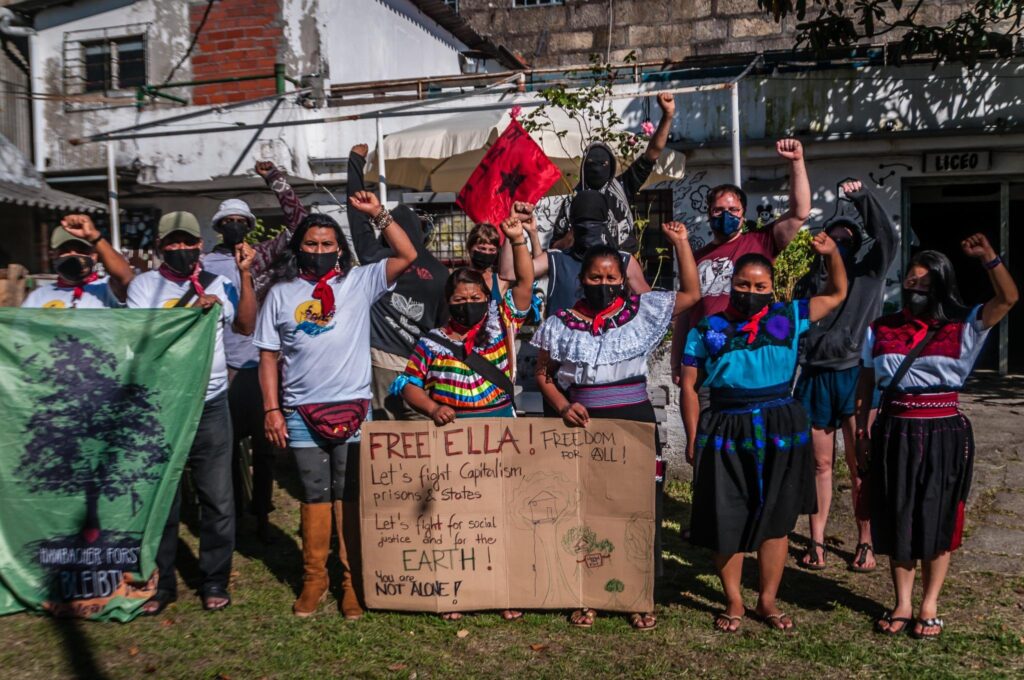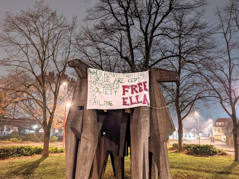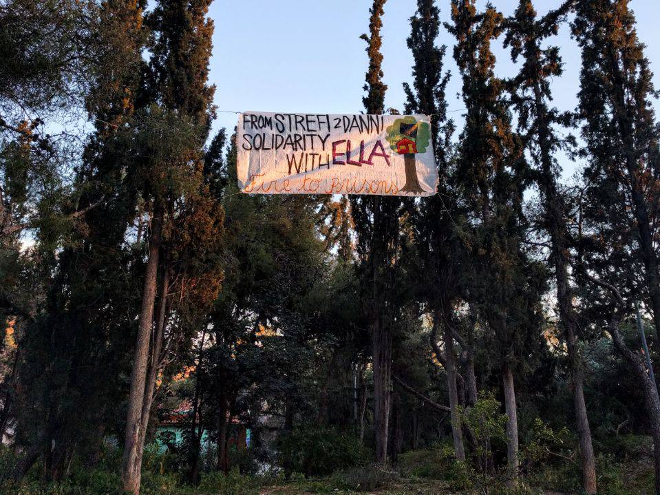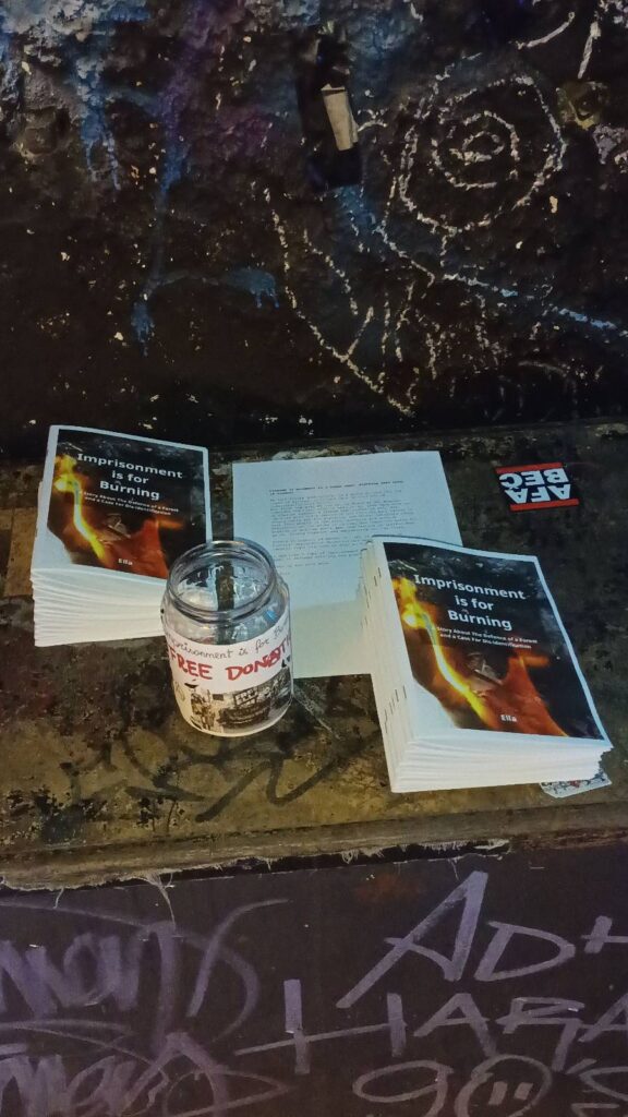 Having to digest a sentence of 2 years and 3 months, days spent in high security isolation and then arriving at a visit from a new lawyer, depleted and doubtful, I was greeted with the news that one of the most legendary living revolutionary groups had sent their solidarity in a video message. The Zapatistas reclaiming their land and freedom, defying the Mexican government and globalization since 1994 with armed forces, reaching out to me? My spine felt instantly straighter, mind sharpened. My gratitude for those that show their love and support in these acts that serve our connection expand beyond description. Source: https://www.ya-basta-netz.org/zapatistische-solidaritaet-mit-ella-freeella/It was also an empowering honour to know that comrades in Athens were thinking about me, and telling this story from the tree tops of Strefi Hill. Both of us in defence of wild and free spaces, Strefi struggles against gentrification and touristification of their anarchist neighborhood, Exarchia. Works on the hill have since December 2023 been cancelled! https://unicornriot.ninja/2024/altering-exarcheia-from-the-square-to-strefi-hill-a-timeline-and-film/ Photo credit: comradesOr when anyone is kept imprisoned, society is failing? I agree that it is appropriate to restrain truly “dangerous” people, although I further that it is even more appropriate to compassionately get these people the help they need, without so much suffering. Perhaps society’s success lies in its ability to give help asked for, and its knowing that in doing so it is helping itself. Photo credit: https://klimakollektivol.de/free-ella-informationen-zum-prozessauftakt/”We are the weeds that keep coming back” living tripod barricade on one of Danni’s forest roads. A reminder to civilisation that it would be better off when it integrates the wild best interests of those it sees as other to itself. A premonition for the multitude of forest occupations that sprouted like scattered seeds after the Danni eviction.”Freedom & Life, give solidarity into the prisons” play on a poem written by anonymous imprisoned comrade ‘Carl’, who was charged with blocking operations at a coal mine. Photo taken at the former Fechenheimer forest, Frankfurt, occupied from 2021 – 2023 against tunnel infrastructure joining highways A66 & A661. Photo credit: comradesImprisonment is for Burning gets tabled by comrades at the Vienna Anarchist Bookfair, proceeds going towards migrant solidarity funds. Communities are at liberty & responsibility to print and distribute IIFB, sharing proceeds for purposes of supporting projects for a new earth and society based on care and fairness. Photo credit: comrades