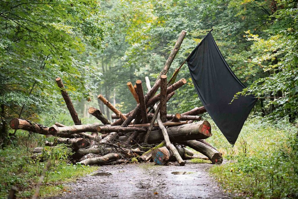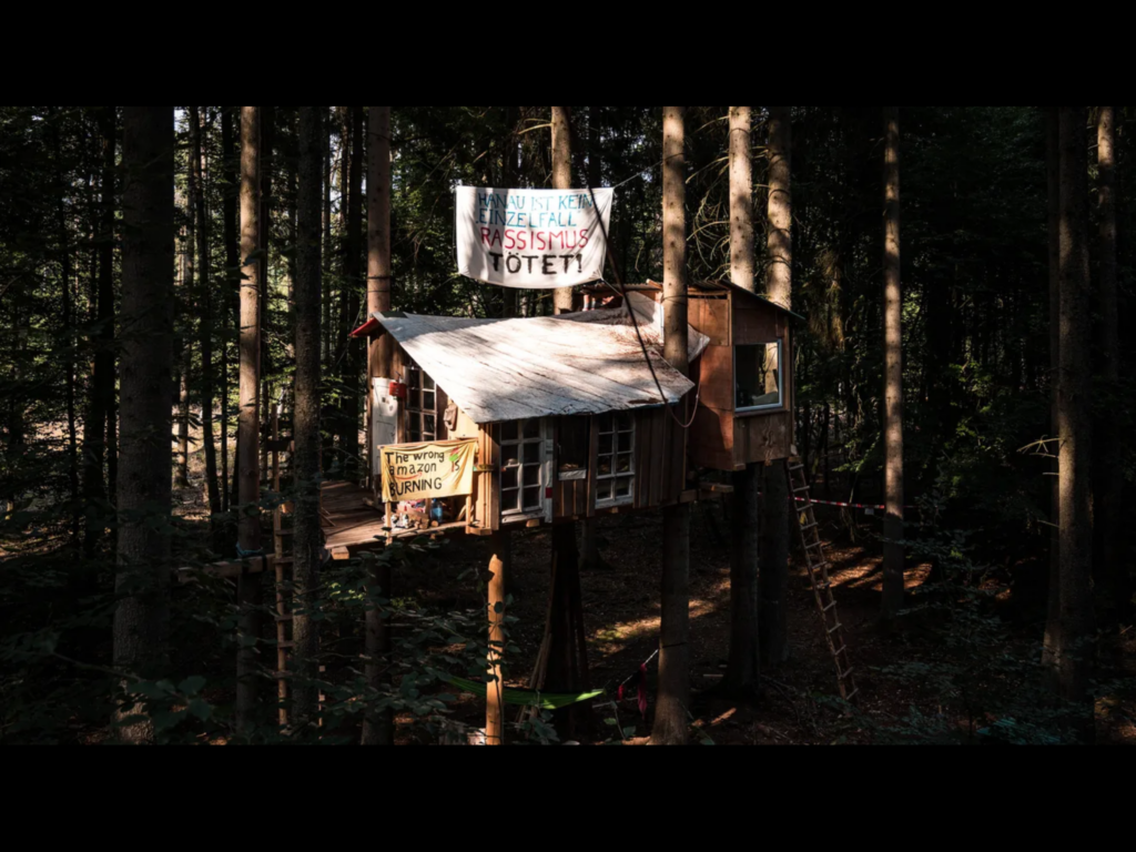 Enter through the black flag, a colour of rebirth. A slash-pile barricade at the southern entrance of Dannenröder forest in times of peace. Made from organic industrial waste during falling financial economic prices for timber, and people’s represented boundary for self-determination. Credit https://jungle.world/artikel/2021/39/ein-klima-fuer-radikalitaetDo you know that experience of arriving somewhere at night, and then getting up in the morning to see it in the light? This was matched with having a comrade on the side of my bunk, as delighted to see me as I them. The above banner translates as “ Hanau is not a single case, racism kills!”, referring to the 2020 shooting of 11 people of migrant background, by right wing extremism in the region of Hessen. Credit https://www.zeit.de/campus/2020-09/dannenroeder-forst-umweltschutz-klimaaktivismus-rodung-autobahnausbau/seite-2